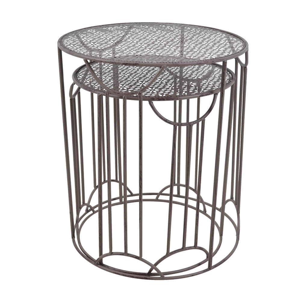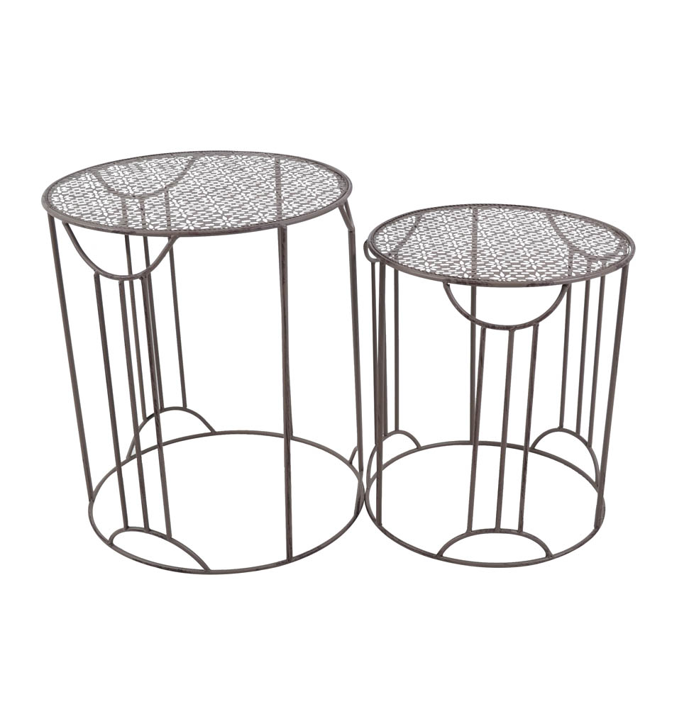 Σετ δύο τεμαχίων τραπεζάκια μεταλλικά στρογγυλά σε καφέ αντικέ χρώμα. διάτρητη διακόσμηση στην επιφάνεια τους και περίτεχνο σχέδιο στον σκελετό τους. Διάσταση μεγάλου 48x57εκ. διάσταση μικρού 42x48εκ.