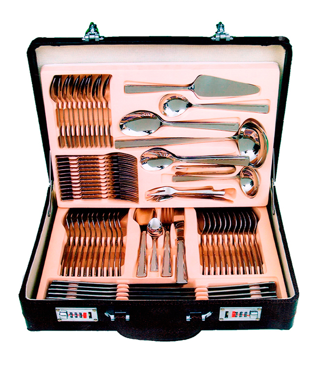 Μαχαιροπίρουνα από ανοξείδωτο ατσάλι 18/10 διατίθενται σε πολυτελή βαλίτσα των 72 τεμαχίων. Τα μαχαιροπίρουνα έχουν μεγάλη αντοχή, δεν φθείρονται εύκολα και είναι ανθεκτικά στο πλυντήριο πιάτων.Το σετ αποτελείται:12 μαχαίρια φαγητού12 πιρούνια φαγητού12 κουτάλια φαγητού12 πιρουνάκια γλυκού12 κουταλάκια γλυκού1 κουτάλα σούπας1 κουτάλι σάλτσας1 ζεύγος σαλάτας2 κουτάλια σερβιρίσματος1 σπάτουλα1 λαβίδα2 πιρούνια σερβιρίσματος1 κουτάλι μουστάρδας1 κουτάλι κρέμας