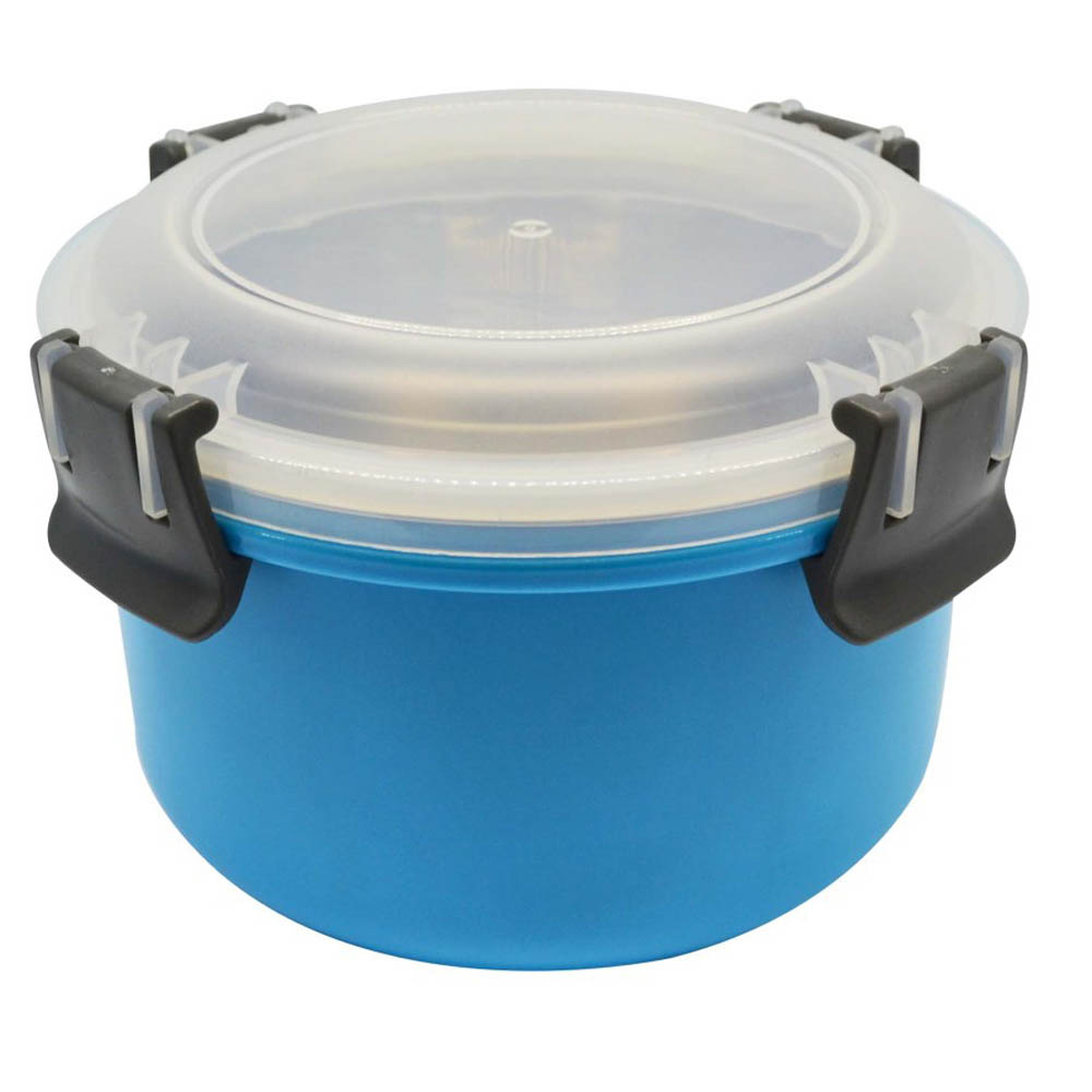 Φαγητοδοχείο στρογγυλό διπλό, με ανοξείδωτο το εσωτερικό δοχείο και πλαστικό το εξωτερικό σε μπλε χρώμα. Διαθέτει πλαστικό καπάκι ασφαλείας και αεροστεγές κλείσιμο για να διατηρεί φρέσκο το φαγητό. Κατάλληλο για το πλυντήριο πιάτων.BPA-Free. Ασφαλή δοχεία αποθήκευσης και μεταφοράς φαγητού με πρωτότυπο σχεδιασμό. Ιδανικά για το σχολείο, το γραφείο ή την εκδρομή. Κατάλληλα για χρήση στο φούρνο μικροκυμάτων αφαιρώντας την εσωτερική θήκη και το καπάκι και κατάλληλο για χρήση στο φούρνο για ζέσταμα μόνο το ανοξείδωτο δοχείο.