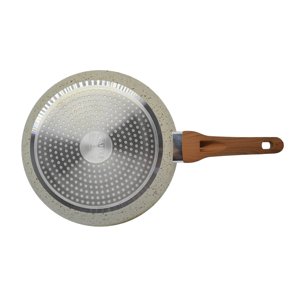 Τηγάνι αλουμινίου με όψη μπεζ πέτρας,με διπλή αντικολλητική επίστρωση εσωτερικά και βιομηχανικό πάτο.Διαθέτει εργονομική αντιολισθητική λαβή από βακελίτη με όψη καφέ ξύλου. Είναι κατάλληλο για όλες τις εστίες κ ασφαλή για πλύσιμο στο πλυντήριο πιάτων.. Τηγάνι υψηλής ποιότητας με άψογη απόδοση μαγειρέματος, τέλεια κατανομή θερμότητας σε όλη την επιφάνεια του σκεύους, αλλά και μοντέρνο σχεδιασμό. Ιδανικό για υγιεινό μαγείρεμα χάρη στις αντικολλητικές του ιδιότητες καθώς χρειάζεται ελάχιστη ποσότητα λαδιού. Κατάλληλο για όλες τις εστίες γκαζιού, ηλεκτρικές, κεραμικές και επαγωγικές καθώς και για χρήση στο πλυντήριο πιάτων. Πάχος στο χείλος 4,2mm και στο πάτο 2,8mm.
