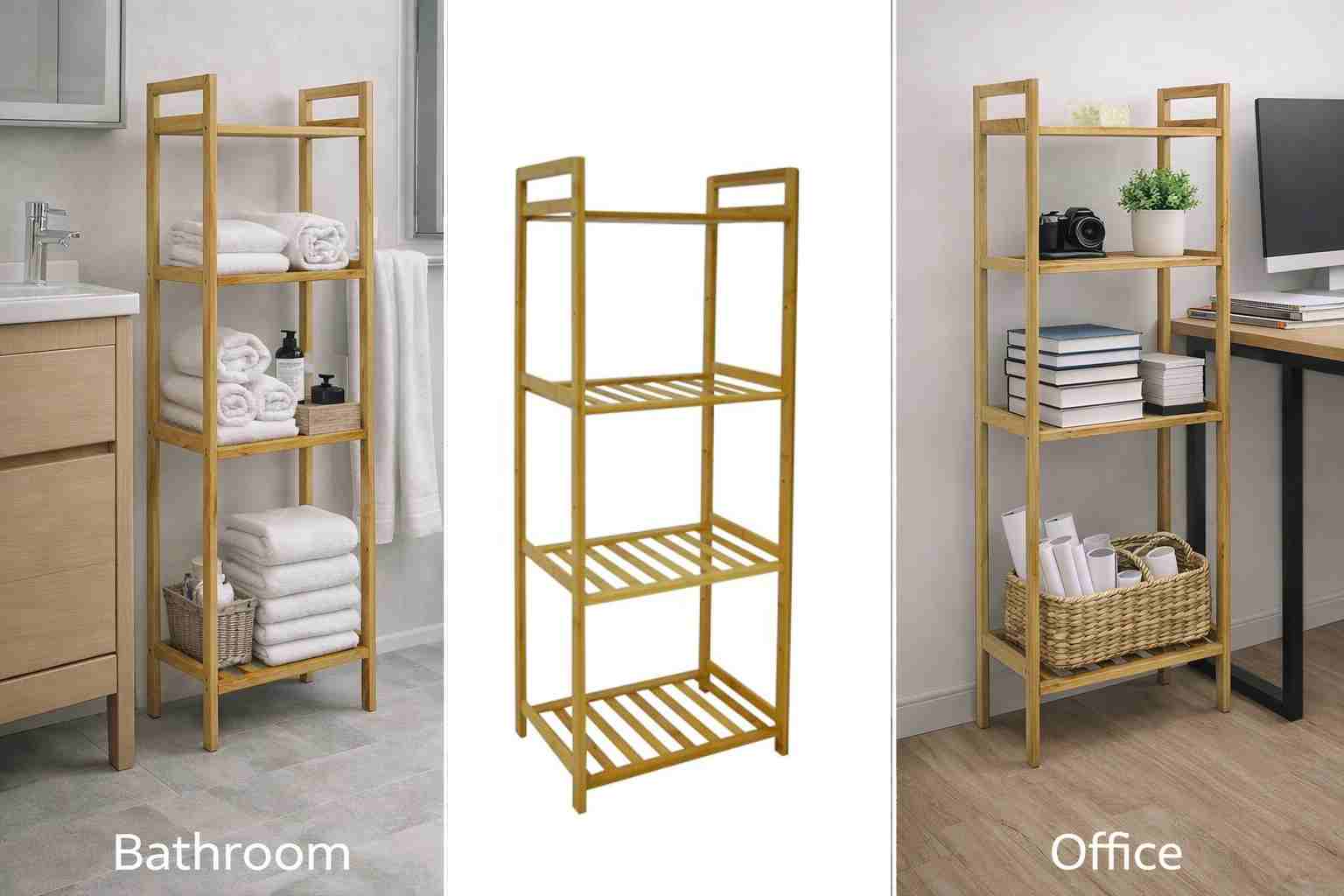 Ραφιέρα από ξύλο μπαμπού σε φυσικό χρώμα αποτελούμενη από 4 ράφια τα οποία προσαρμόζονται σύμφωνα με τις ανάγκες σας. Για μεγαλύτερη σταθερότητα στη συσκευασία συμπεριλαμβάνονται βίδες και για τον τοίχο.. Λόγω του σχεδιασμού της είναι πολλαπλών χρήσεων καθώς μπορεί να χρησιμοποιηθεί στο σαλόνι, στο υπνοδωμάτιο, στο γραφείο ή στο μπάνιο.