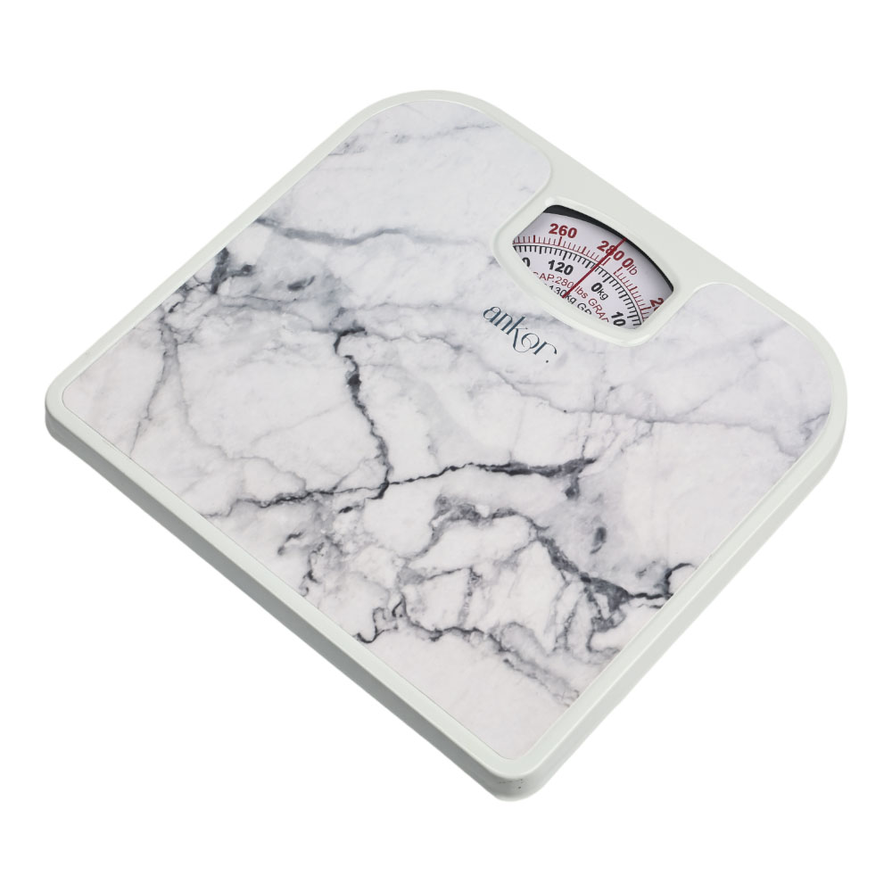 Ζυγαριά μπάνιου μηχανική με μέγιστο βάρος μέτρησης 130kg και διακόσμηση εφέ άσπρο μάρμαρο.