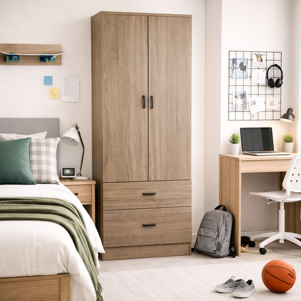 Εξαιρετικής κατασκευής, με δύο φύλλα, μεταλλική ράγα για κρεμαστά ρούχα και δύο συρτάρια. Συναρμολογούμενη σε συσκευασία KD. Ξύλινα έπιπλα κομψού και μοντέρνου σχεδιασμού ιδανικά για κάθε χώρο. Αποτελούν πρακτική λύση για κάθε σπίτι καθώς ταιριάζουν σε κάθε στυλ διακόσμησης. Ανανεώστε το σαλόνι, το γραφείο ή το υπνοδωμάτιο εύκολα και οικονομικά. Επιλέξτε το χρώμα και το σχέδιο που ταιριάζει απόλυτα στον χώρο σας. Διαστάσεις Κιβωτίου : 193x53x10,5.