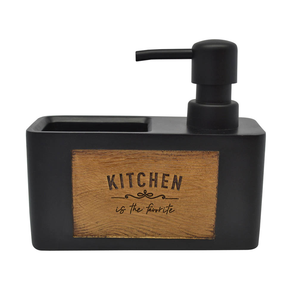 Σαπουνοθήκη για υγρό σαπούνι πολυεστερική σε μαύρο χρώμα, διακόσμηση από ξύλο μπαμπού και επιγραφή Kitchen. Διαθέτει θήκη για σφουγγάρι. Στην συσκευασία συμπεριλαμβάνεται το συρμάτινο σφουγγάρι.. Αξεσουάρ κουζίνας εξαιρετικής ποιότητας με μοντέρνο και κομψό σχεδιασμό. Συνδυάστε τα ιδανικά με αντικείμενα της υπόλοιπης σειράς. Ανανεώστε και οργανώστε την κουζίνα σας εύκολα και οικονομικά.