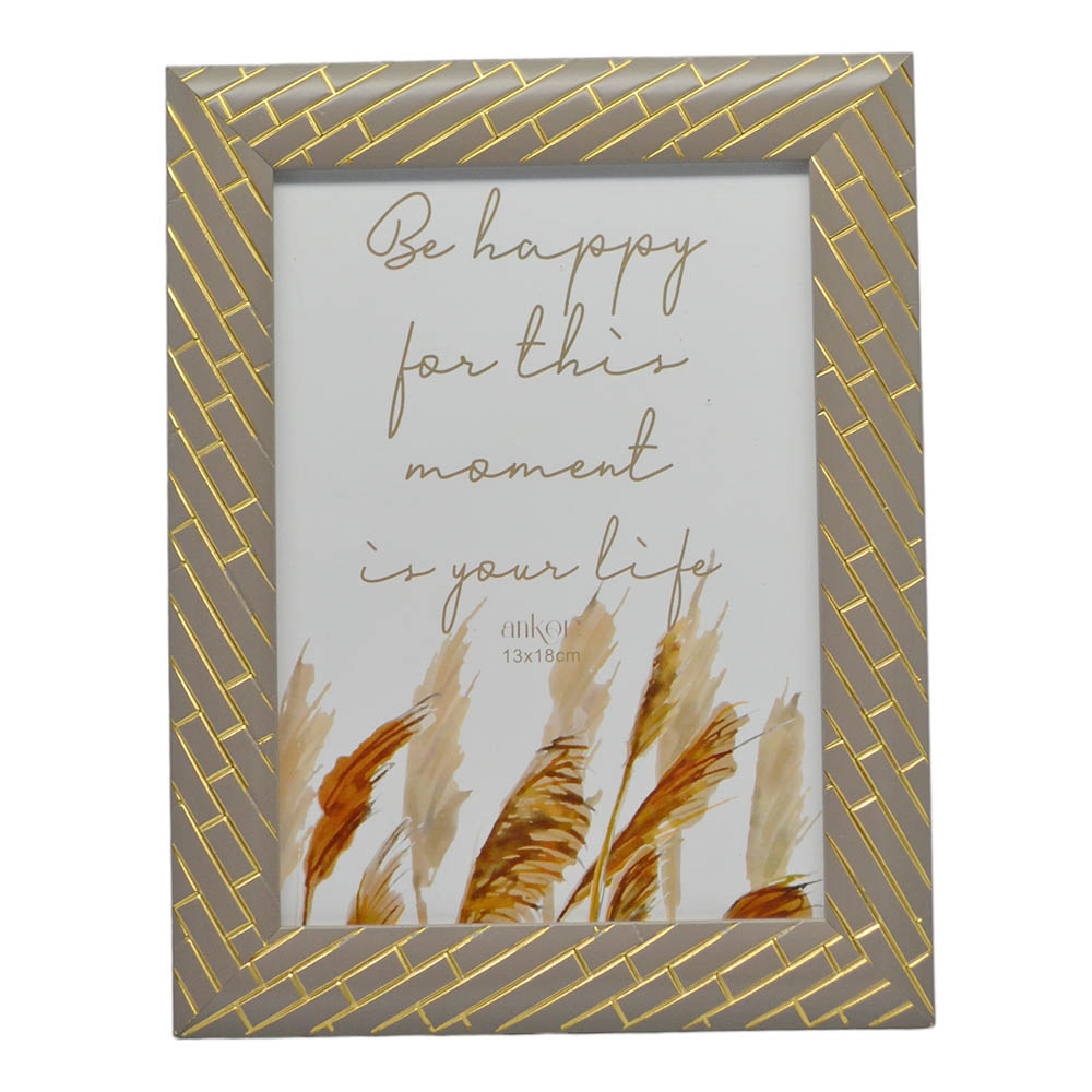 Κορνίζα πλαστική σε μπεζ νουντ χρώμα με διακόσμηση χρυσές γραμμές. Περιστρέφεται δίνοντας τη δυνατότητα τοποθέτησης οριζόντιας ή κάθετης φωτογραφίας κ κρεμιέται στον τοίχο.