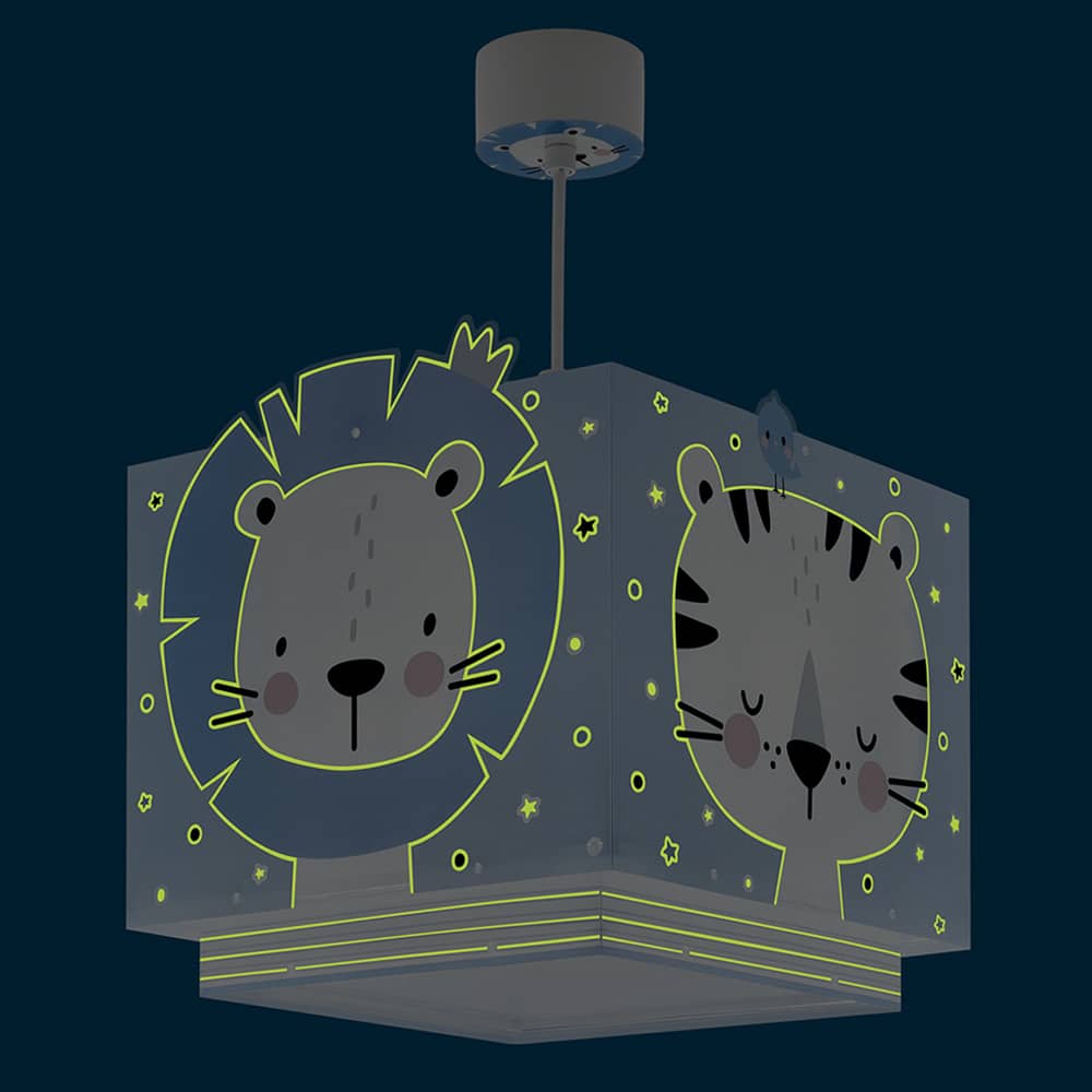 Καλωσορίστε το παιδί σας σε ένα δωμάτιο πλημμυρισμένο από μαγεία με αυτό το παιδικό φωτιστικό οροφής κατάλληλο για γενικό φωτισμό. Είναι διπλού τοιχώματος με διάφανο το εξωτερικό του τοίχωμα και μαγικά φωσφορίζοντα μέρη στο σκοτάδι. Παρέχεται διαχυτής φωτός για τις μικρότερες ηλικίες προσφέροντας ομοιόμορφο φωτισμό. Το Baby Jungle Blue κρεμαστό φωτιστικό οροφής τοποθετείται εύκολα και είναι κατασκευασμένο εξ ολοκλήρου στην Ευρώπη.