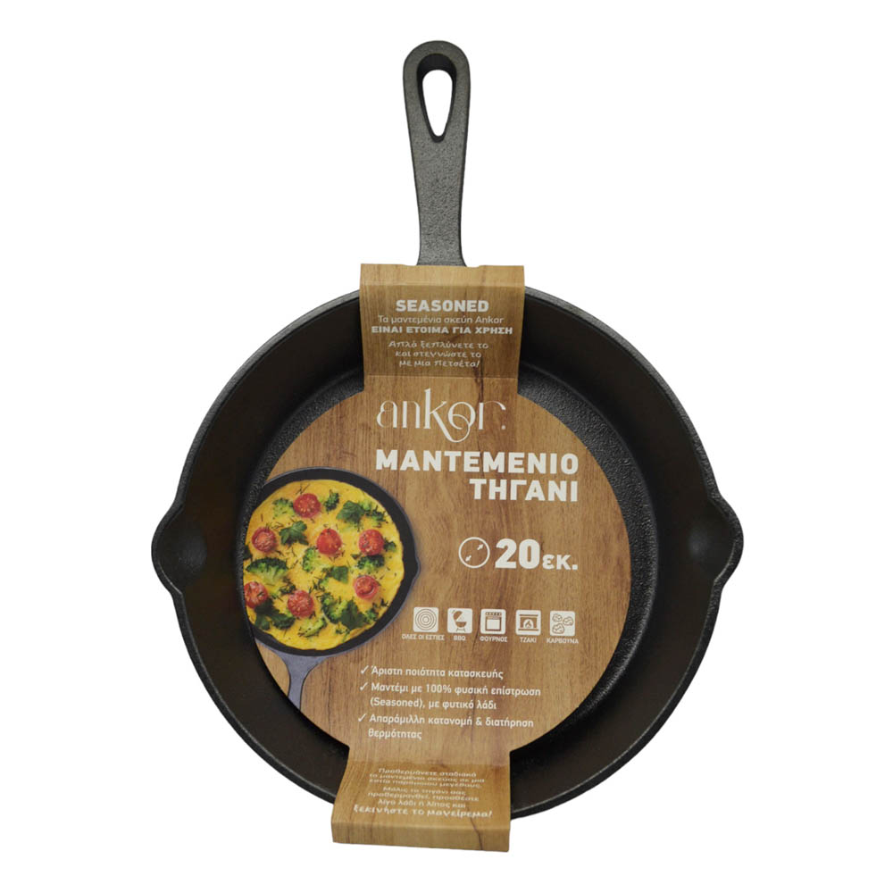 Τηγάνι από μαντέμι 20εκ. με 100% φυσική επίστρωση (seasoned) με φυτικό λάδι κ έτοιμο για χρήση.Κατάλληλο για χρήση σε όλες τις εστίες,τις ψησταριές μπάρμπεκιου κ τους φούρνους.Παρέχει εξαιρετική κατανομή κ διατήρηση θερμότητας για ένα ομοιόμορφο μαγείρεμα. ΚΑΘΑΡΙΣΜΟΣ-ΦΡΟΝΤΙΔΑ Βήμα 1: Αφού τελειώσετε με το μαγείρεμα, αφήστε το μαντεμένιο σκεύος σας να κρυώσει εντελώς, πριν το ξεπλύνετε με ζεστό νερό. Μπορείτε να χρησιμοποιήσετε μια μικρή ποσότητα σαπουνιού. Για επίμονους λεκέδες, σιγοβράστε λίγο νερό για 3-5 λεπτά και μετά χρησιμοποιήστε τη ξύστρα αφού κρυώσει το τηγάνι. Βήμα 2: Στεγνώστε αμέσως και προσεκτικά με ένα πανί χωρίς χνούδι ή χαρτοπετσέτα. Στα μαντεμένια σκεύη δεν αρέσει η συνεχής επαφή με το νερό. Εάν παρατηρήσετε λίγο μαύρο υπόλειμμα στην πετσέτα σας, είναι απλώς το seasoning και είναι απολύτως φυσιολογικό. Βήμα 3: Περάστε με ένα λεπτό στρώμα λαδιού μαγειρέματος ή σπρέι seasoning την επιφάνεια του μαγειρικού σκεύους σας. Χρησιμοποιήστε μια χάρτινη πετσέτα για να σκουπίσετε την επιφάνεια μέχρι να μην παραμείνει υπολείμμα λαδιού. ΣΥΝΤΗΡΗΣΗ-SEASONING Βήμα 1:Περάστε με ένα λεπτό στρώμα λαδιού μαγειρέματος ή σπρέι seasoning την επιφάνεια του μαγειρικού σκεύους σας. Χρησιμοποιήστε μια χάρτινη πετσέτα για να σκουπίσετε την επιφάνεια μέχρι να μην παραμείνει υπόλειμμα λαδιού. Βήμα 2: Τοποθετήστε το σκεύος ανάποδα στο φούρνο . Τοποθετήστε ένα μεγάλο φύλλο ψησίματος ή αλουμινόχαρτο στην κάτω σχάρα. Ψήνουμε στους 200 βαθμούς C για μία ώρα. Αφήστε το να κρυώσει.