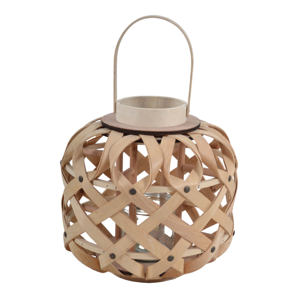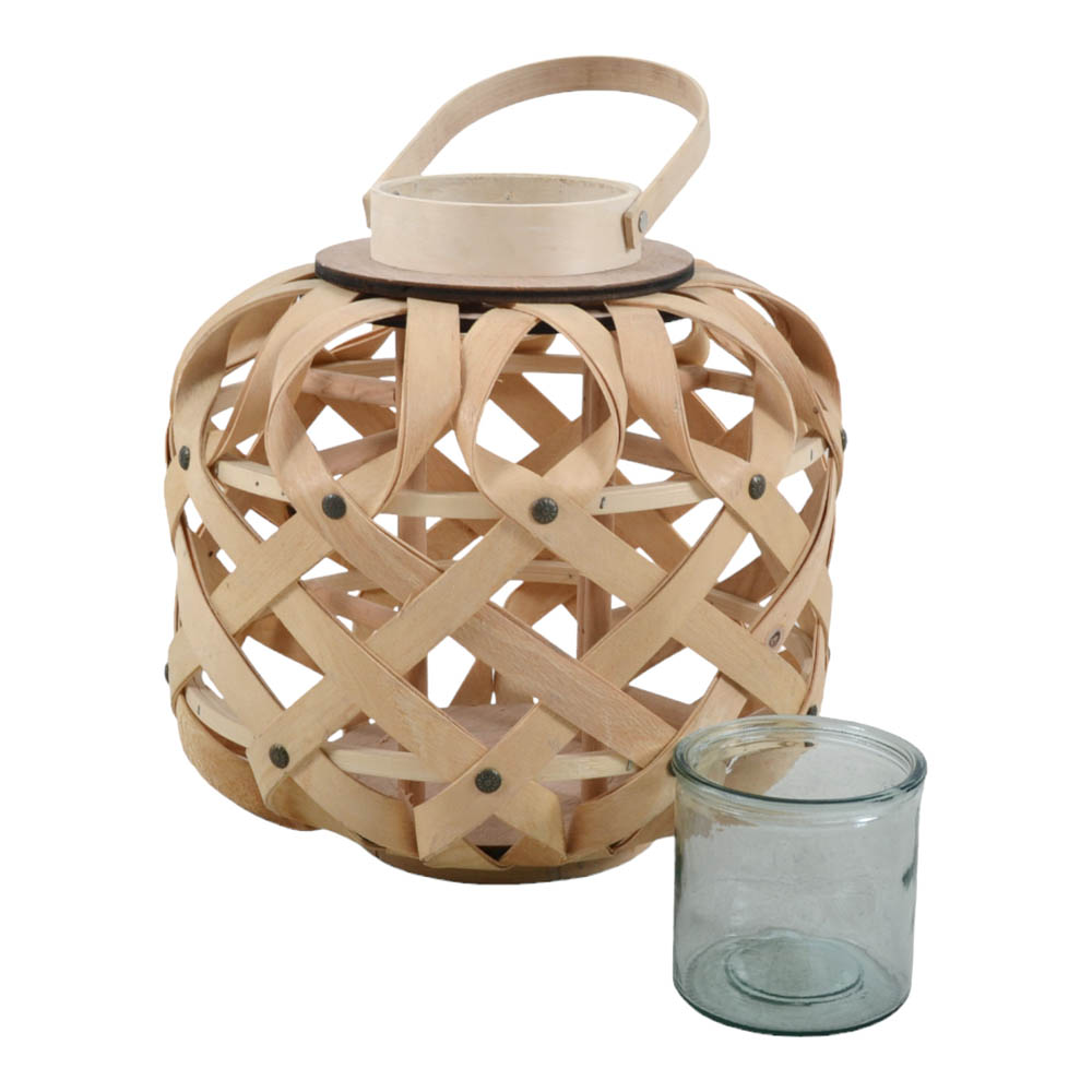 Φανάρι στρογγυλό κατασκευασμένο από ξύλο σε φυσικό χρώμα και λαβή. Το σχέδιο του είναι σε πλεκτό μοτίβο δίνοντας μια μοναδική αισθητική. Στο εσωτερικό του φαναριού υπάρχει ένα γυάλινο ποτηράκι για την τοποθέτηση κεριού.. Ξύλινο φανάρι ιδανικό για να προσθέσει μια ζεστή και φιλόξενη ατμόσφαιρα στο σπίτι, τον κήπο ή το μπαλκόνι σας, ενώ μπορεί επίσης να χρησιμοποιηθεί ως διακοσμητικό στοιχείο σε γάμους και άλλες εκδηλώσεις.
