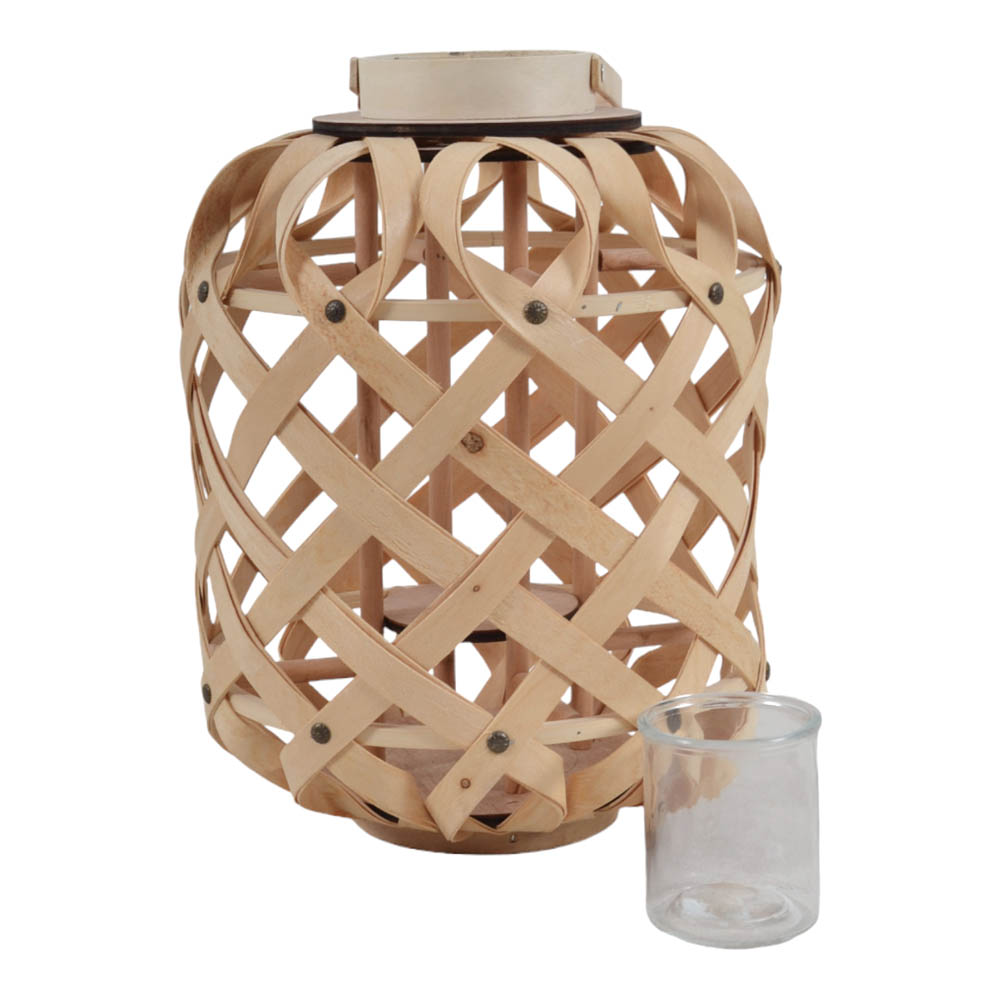 Φανάρι στρογγυλό κατασκευασμένο από ξύλο σε φυσικό χρώμα και λαβή. Το σχέδιο του είναι σε πλεκτό μοτίβο δίνοντας μια μοναδική αισθητική. Στο εσωτερικό του φαναριού υπάρχει ένα γυάλινο ποτηράκι για την τοποθέτηση κεριού.. Ξύλινο φανάρι ιδανικό για να προσθέσει μια ζεστή και φιλόξενη ατμόσφαιρα στο σπίτι, τον κήπο ή το μπαλκόνι σας, ενώ μπορεί επίσης να χρησιμοποιηθεί ως διακοσμητικό στοιχείο σε γάμους και άλλες εκδηλώσεις.