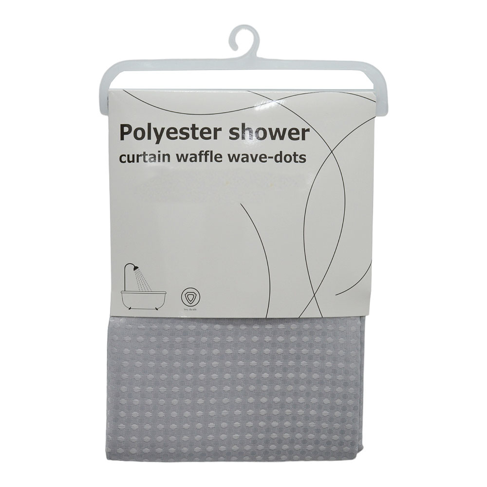 Κουρτίνα πολυεστερική 115gsm, αδιάβροχη, σε γκρι χρώμα με ζακάρ διακόσμηση. Στη συσκευασία συμπεριλαμβάνονται δώδεκα πλαστικοί κρίκοι. Είναι εύκολη στο καθάρισμα, μαλακή και ευχάριστη αν έρθει σε επαφή με το δέρμα.