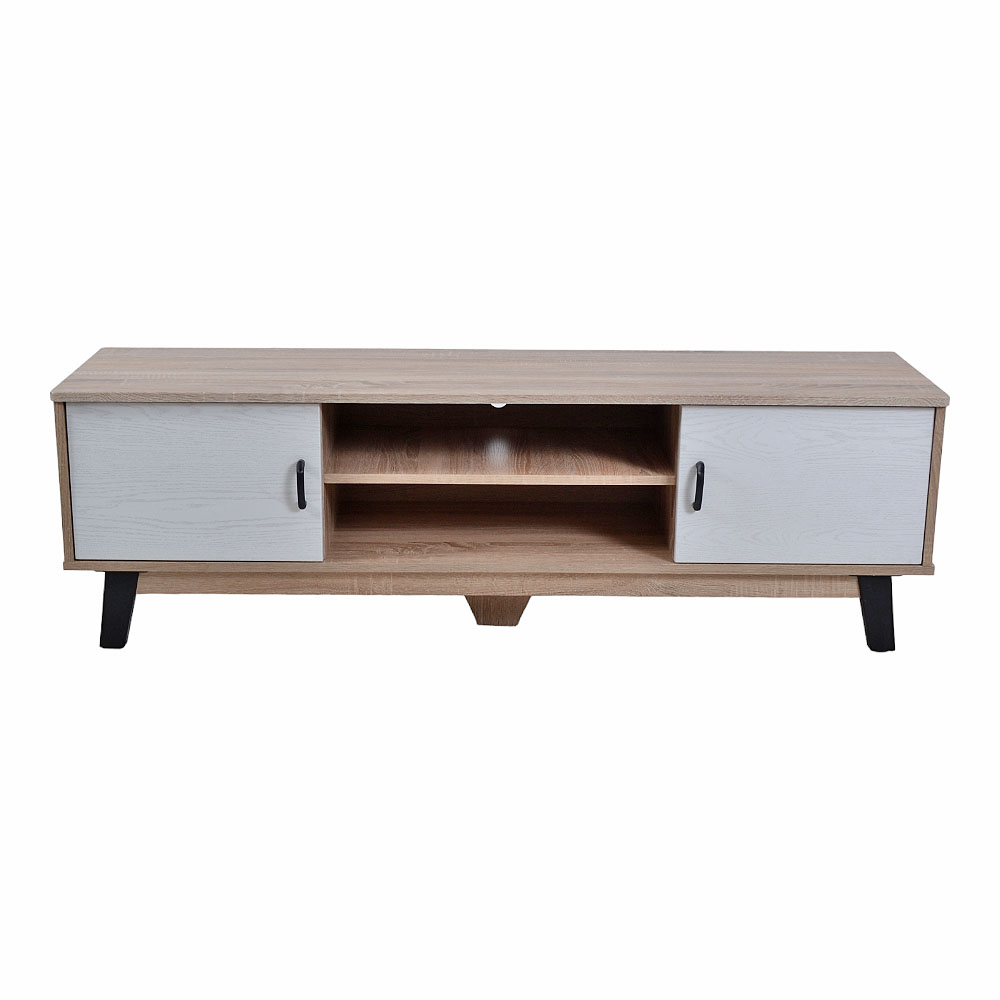 Έπιπλο για την τηλεόραση ξύλινο σε φυσικό χρώμα με δύο άσπρα ντουλάπια, ένα ράφι και κομψά πόδια σε μαύρο χρώμα. Είναι λειτουργικό με μοντέρνο σχεδιασμό και διαχρονικό στυλ. Στην συσκευασία περιλαμβάνονται οδηγίες συναρμολόγησης.