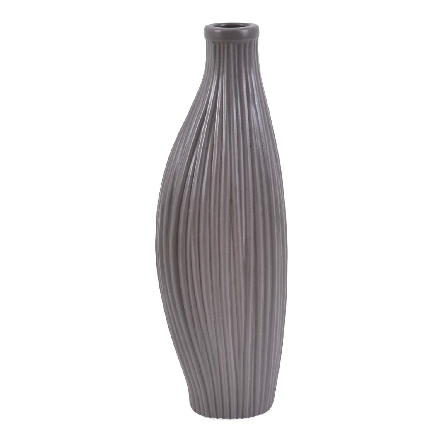 Κεραμικό βάζο επίμηκες με ανάγλυφη υφή και περίτεχνο σχήμα σε γκρι καφέ χρώμα. Κατάλληλο για να περιέχει νερό, ιδανικό για την ανάδειξη φρέσκων λουλουδιών ή διακοσμητικών κλαδιών. Προσδίδει κομψότητα και στυλ σε κάθε χώρο.