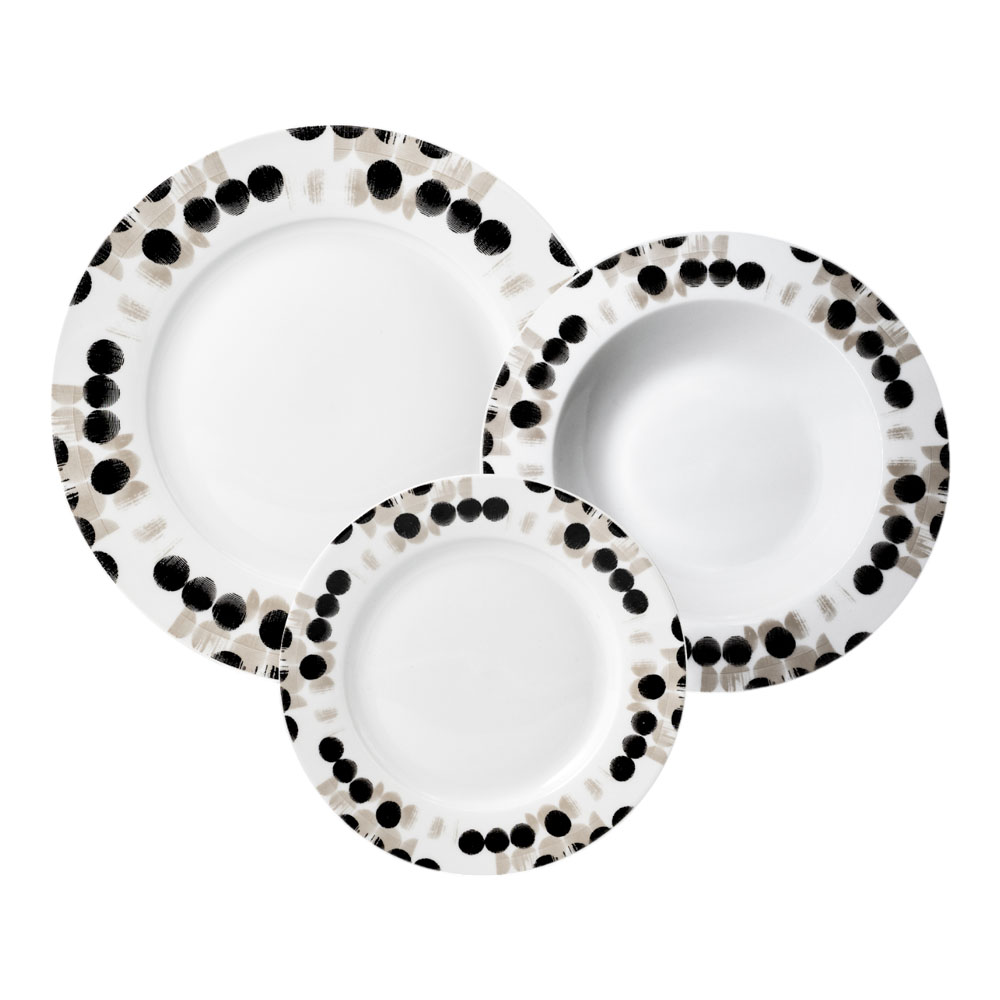 Σερβίτσιο φαγητού από ποιοτική πορσελάνη, στρογγυλό, με πουά μοτίβο στο πλαίσιο σε μαύρο κ μπεζ χρώμα.Το σετ περιλαμβάνει 6 πιάτα ρηχά 26εκ.,6 πιάτα βαθιά 21,5εκ. και 6 πιάτα φρούτου 19εκ.Κατάλληλο για χρήση στο πλυντήριο πιάτων κ τον φούρνο μικροκυμάτων.