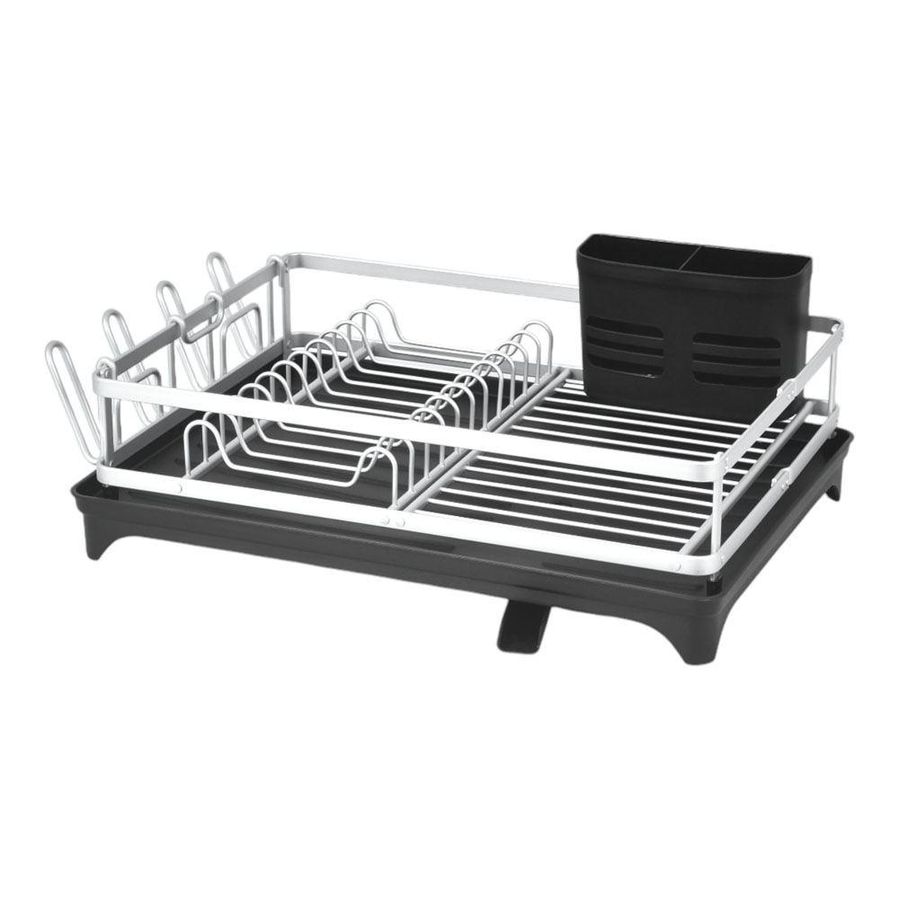 Πιατοθήκη από αλουμίνιο σε ασημί ματ απόχρωση, με μαύρο ματ πλαστικό δίσκο και αποσπώμενη κουταλοθήκη. Διαθέτει στόμιο αποστράγγισης για την αποφυγή συσσώρευσης νερού στον δίσκο. Εύκολη στον καθαρισμό και στη συντήρηση.