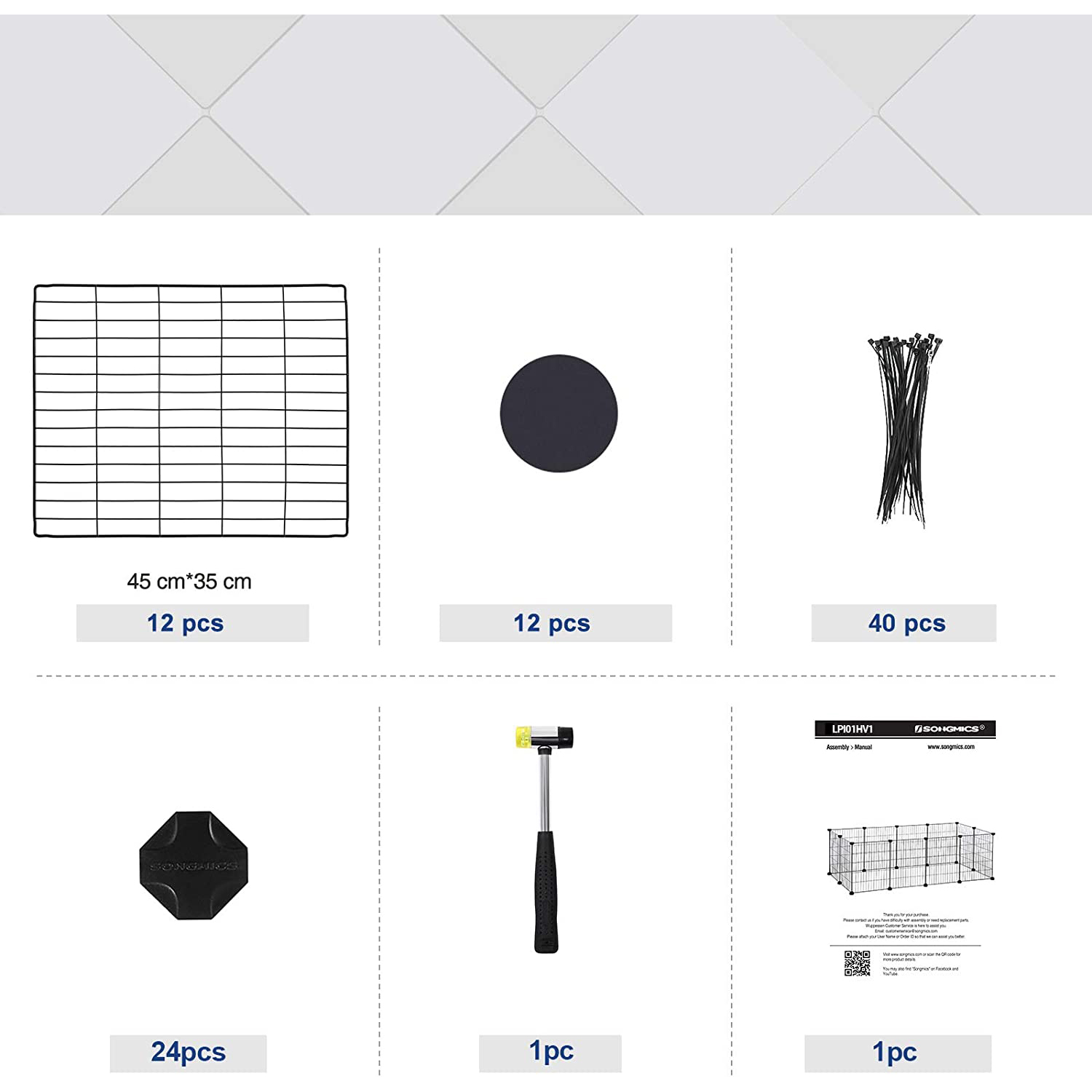 WHAT YOU GET: 12 grid plates, 24 plastic connectors, 12 anti-slip pads, 1 rubber mallet, 40 cable ties—all the elements you need to build a small animal paradise!