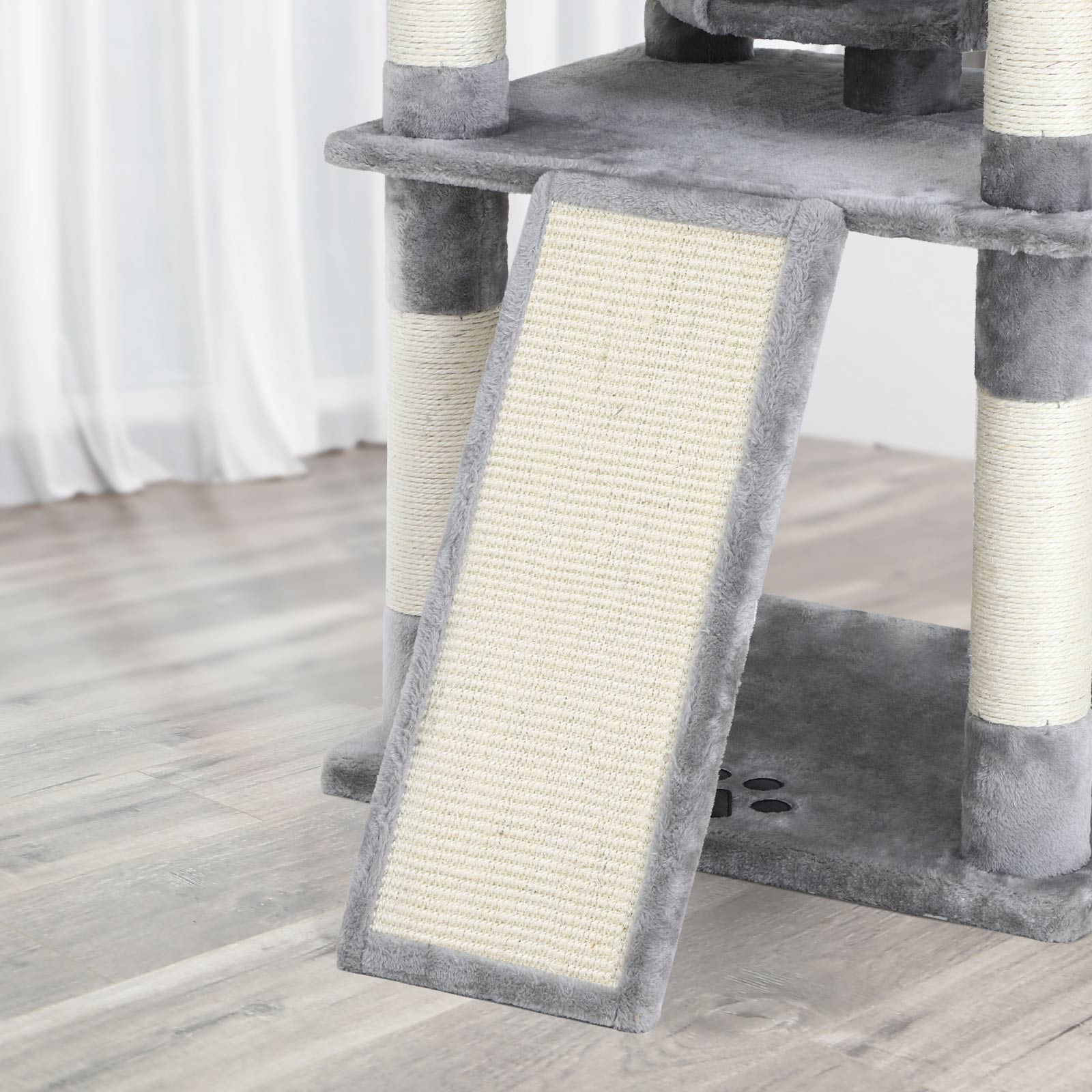 With a Playground on the First Floor: In addition to the comfortable resting places in the upper areas of the cat tree, there is an exciting playground with an inclined scratching board in the lower area