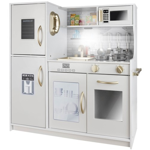 WOODEN KITCHEN XL + SOUNDS + LIGHT + ACCESSORIES LED LIGHTING AND SOUNDS - the kitchen comes with an LED light that can be placed under the cabinet, in the cabinet or in the oven - the choice is yours! The lighting will make the child feel like they are in a real kitchen , it will have an even greater effect when the room is already dark, and the light will allow the child to prepare dinner for dolls, a teddy bear or their parents. Additionally, the burners in the stove click when you switch the knobs ! Your child will be delighted - the kitchen will allow for many hours of fun. FREE ACCESSORIES FOR THE CHEF - we add 4 spoons to the set: a ladle, a spaghetti spoon, a slotted spoon and a pasta scoop; a pot, a frying pan and a lid . The sink in the stove is removable, the child / parent can fill it with water and wash the 'dirty' dishes after the play is over. WOODEN – the cooker is made of high-quality wood, which significantly affects the length of its use and the safety and health of the youngest. This is a timeless proposition that will delight every toddler. Thanks to its classic appearance, it has always enjoyed great recognition. Exceptionally careful workmanship with aesthetic finish and attention to the smallest details add value and is pleasing to the eye. The kitchen can also successfully fulfill a decorative function and be an ornament to a child's room. AFFECTS CHILD DEVELOPMENT – role-playing not only provides entertainment, but also develops imagination and stimulates creative thinking, teaches teamwork and improves social and integration skills. It causes an increase in manual and acting skills, and can also become an inspiration and contribute to the success of a future chef . SPECIFICATION - age: 3+; colour: white + gold; material: wood; lamp power supply: 3 x AAA battery (not included); dimensions: 80x80.5x24cm; set weight: 12.7kg; weight with packaging: 13.65kg.