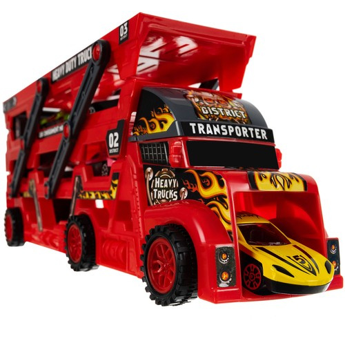 TRUCK CAR SET WITH 6 CARS LAUNCHER - the truck has a car launcher. Just unfold the rear part of the trailer and you're done! To launch the car, you need to stretch the protruding track element, place the car in front of it, press the button at the end of the track and watch the car race! The track runs through the lowest level of the tow truck and exits at the truck's hood. It's the perfect mechanism to gain an advantage in a crazy race. TOW TRUCK + 6 CAR - the set consists of a truck and 6 cars. The trailer has an unfolding function, thanks to which you can easily remove the cars. The toy was made very carefully, reproducing all the details. It looks realistic, which encourages the child to play. 3 LEVEL TRAILER - the trailer has 3 levels intended for safe transport and storage of cars, thanks to which your child will not lose a single valuable car and will be able to transport them on race tracks around the world. DURABLE – the toy is made of high-quality plastic and metal, so is extremely durable. It will serve your child for many years. SPECIFICATION – colour: red + black; material: truck (PP) + 6 cars (zinc alloy); number of cars: 6; dimensions of the trailer (length/width/height): 30 x 11.5 x 7 cm; weight: 0.440 kg; weight in packaging: 0.560 kg.