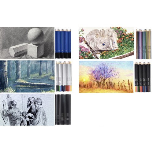 12 Sketching Pencils (2H / 3H / 4H / 5H / HB / B / B2 / B3 / B4 / B5 / B6 / B8) 12 charcoal pencils (4x 2B, 4x 4B, 4x 6B) 12 watercolour pencils 12 metallic crayons, 12 pencil crayons double-ended pencil extender 1 sharpener 4 pastel crayons 3 pendants - grinders white eraser paper cutter sketchbook brush sandpaper block case