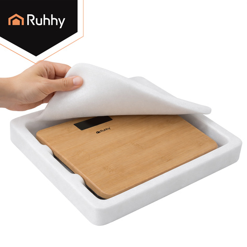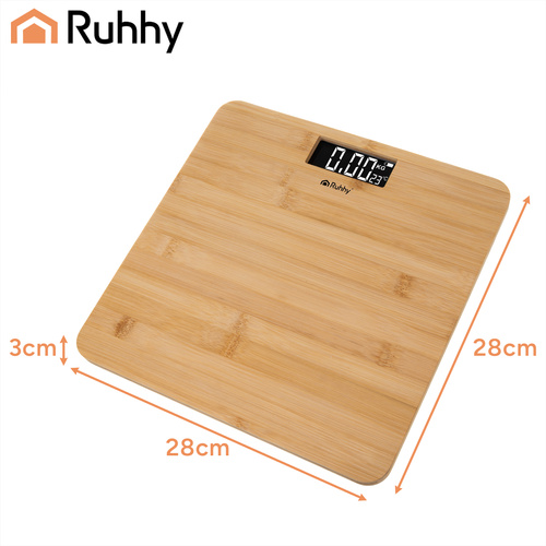 BAMBOO BATHROOM SCALE UP TO 180kg PRACTICAL – the presented LCD bathroom scale is an extremely practical accessory, designed for those who care about their health and who care about maintaining a proper figure and physical condition. This is a perfect solution for both athletes and people trying to lose weight. DURABLE AND READABLE - precise electronic bathroom scale is an extremely durable accessory - the minimum user weight is 7 kg, while the maximum weight is as much as 180 kg. The large LCD display ensures convenient reading of results . AUTOMATIC SHUT-OFF - the bamboo LCD scale has an automatic shut-off option after 8 seconds , which saves energy and increases the convenience of use. The device is powered by 2 AAA batteries and has a battery charge indicator . ANTI-SLIP FEET – the LED bathroom scale is equipped with anti-slip feet that make it safe to use and prevent it from moving on slippery surfaces when using it. SPECIFICATION – material: bamboo, others: PP + PVC; weighing unit: kg and lb; minimum weight: 0.002 kg, maximum user weight: 180 kg; display: LCD; automatic shutdown: after 8 seconds; power supply: 2 x AAA battery; battery charge indicator; ambient temperature measurement; dimensions: 28 x 28 x 3 cm; weight: 0.856 kg; weight in packaging: 0.967 kg.