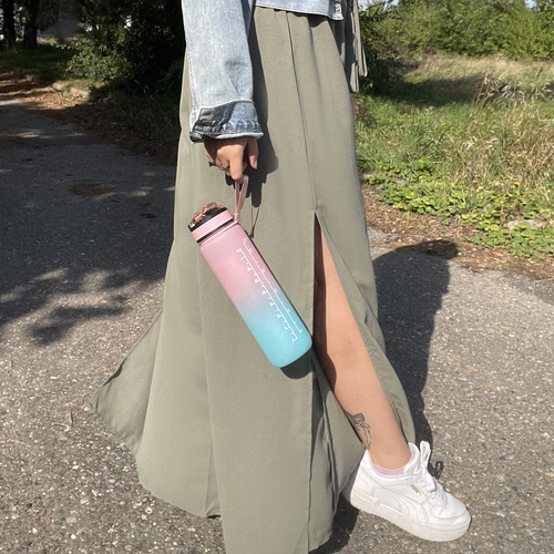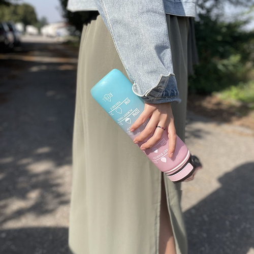MOTIVATIONAL WATER BOTTLE HIGH QUALITY MATERIAL - 1 L motivational bottle It is made of durable, health-safe PP (polypropylene) material , which makes it light and at the same time impact resistant . The mouthpiece is made of soft silicone, safe for teeth and gums , which ensures comfort while drinking . The bottle is in pastel pink and blue color , which gives it an aesthetic and fashionable look, suitable for everyday use. Inside there is long, removable tube , thanks to which you don't have to tilt the bottle to drink - just suck the liquid through the mouthpiece . The bottle can be used at temperatures from -20 ° C to 80 ° C. SAFETY AND TIGHTNESS - the bottle is equipped with an innovative anti-spill system . Silicone gasket under the cap and tight closure protects against leakage , even if the bottle tips over or is placed in a bag. The locking pin of the closing mechanism is reliable - you need to download it and then press the button to open the bottle , which protects against accidental leaks . This makes the bottle a great solution for active people, children and those who travel often. PRACTICAL AND MOTIVATING - the bottle has graduations both in milliliters (up to 1000 ml) and ounces (up to 32 oz) , which allows easy to track your water intake throughout the day . On the second page you will find hour scale (from morning to evening) which makes it easier to plan your irrigation . Additional Motivational slogans help maintain healthy habits of drinking the right amount of water during the day , reminding you to hydrate your body regularly. The bottle is easy to clean , which ensures proper hygiene, and thanks to removable straw is convenient to use. ACCESSORIES AND COMFORT OF USE - the bottle comes with comfortable headband made of PP which is placed under the cap , with a practical handle allowing you to easily hold the bottle or hang it, e.g. on a backpack. This is especially useful during physical activity, trips or travel. Additionally, the set includes colorful stickers that can be used to personalize the bottle, giving it an individual character. Such a set makes the bottle not only practical, but also an aesthetic accessory, perfect for both adults and children . BOTTLE SPECIFICATION - colour: pink blue; coating type: matte; material: PP, silicone; mouthpiece: yes; handle: yes; operating temperature: -20 to 80 degrees C; capacity: 1l; dimensions: 29 x 7.5 cm; weight: 0.17 kg; weight in packaging: 0.23 kg.