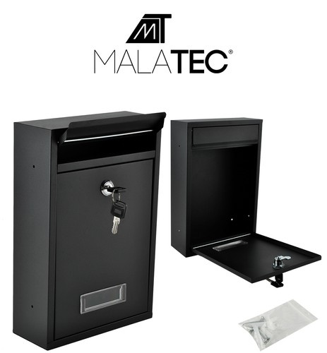 NEWSPAPERS POST MAILBOX - BLACK MADE OF STAINLESS GALVANIZED STEEL - the box is made of galvanized steel, so it will not rust and will serve you for many seasons. The set includes mounting pins and rubber washers / spacers. Thanks to them, you can conveniently screw the box to a fence, for example . For convenience, there are mounting holes in the rear wall. COVERED LETTER ENTRY – the mailbox has an opening secured with a special cover that protects correspondence from weather conditions. ADDRESS WINDOW AND VIEWFINDER – at the front of the door, in a clearly visible place, there is a place where you can insert an address marking in the form of a house number, apartment number or your own name. It also serves as a peephole for checking the contents. 2 KEYS – the set includes a pair of keys, so there is no need to make another copy if the box is operated by additional people. SPECIFICATION - colour: black; material: galvanised steel; screw spacing is 15.5 cm; dimensions: 8.5 x 21.7 x 32 cm; set weight 1.25 kg, weight with packaging: 1.42 kg.