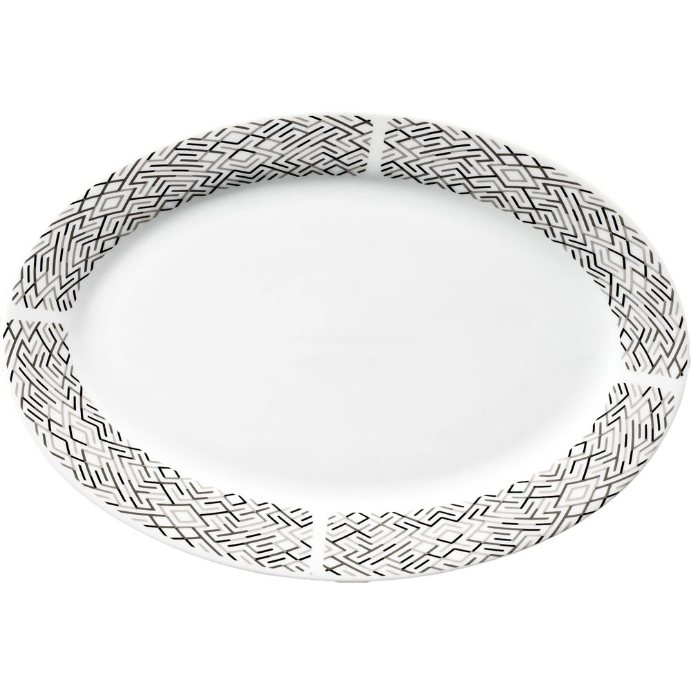 Πιατέλα από ποιοτική πορσελάνη, στρογγυλή σε λευκό χρώμα και διακόσμηση γκρι και μαύρες γραμμές περιμετρικά του πλαισίου. Ποιοτικά πιάτα για το καθημερινό σας τραπέζι...
