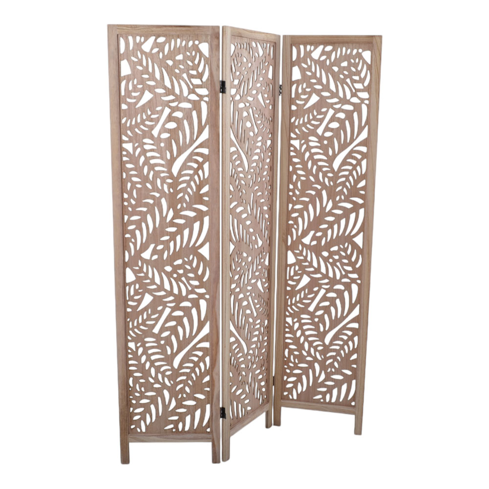 Ξύλινο παραβάν σε φυσικό χρώμα, διακοσμημένο με περίτεχνο διάτρητο σχέδιο φύλλων. Διαθέτει τρία πάνελ τα οποία δημιουργούν μια αίσθηση ιδιωτικότητας αφήνοντας το φως να περνάει διακριτικά. Ιδανικό για να εμπλουτίσει κάθε δωμάτιο με φυσική κομψότητα.. Διάσταση κιβωτίου: 172x42x8εκ.