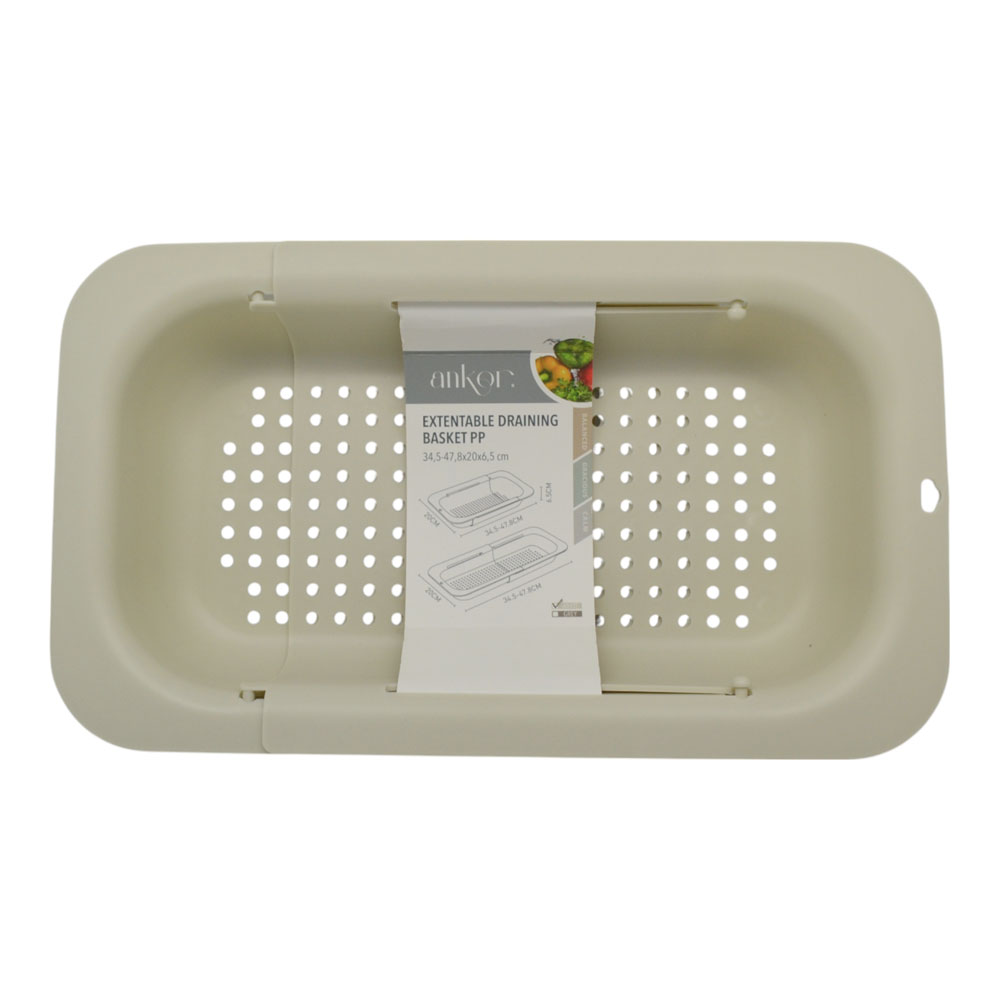 Στεγνωτήρας νεροχύτη πλαστικός επεκτεινόμενος, ιδανικός για το στέγνωμα φρούτων, λαχανικών και σκευών. Κατασκευασμένος από ανθεκτικό πλαστικό προσαρμόζεται εύκολα από 34,5 έως 47,8εκ. ώστε να εφαρμόζει σε διάφορα μεγέθη νεροχυτών.