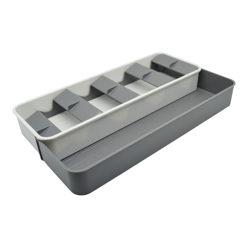 Κουταλοθήκη από ανθεκτικό πλαστικό, με μοντέρνο δίχρωμο σχεδιασμό και πρακτικό μηχανισμό επέκτασης. Προσαρμόζεται στο πλάτος του συρταριού, παρέχοντας επιπλέον χώρο για μεγάλα εργαλεία κουζίνας. Διαθέτει πολλαπλές θήκες για άψογη οργάνωση.. Διάσταση κλειστή: 14x39,5x5,6εκ.