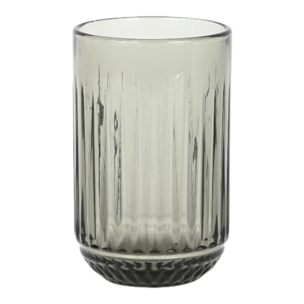 Σετ 6 γυάλινων ποτηριών 410ml με ανάγλυφη διακόσμηση και κομψό smoke γκρι χρώμα. Ο minimal κυλινδρικός σχεδιασμός τους χαρίζει μοντέρνα αισθητική, ενώ η ανθεκτική κατασκευή τα καθιστά ιδανικά για καθημερινή χρήση. Κατάλληλα για πλυντήριο πιάτων.