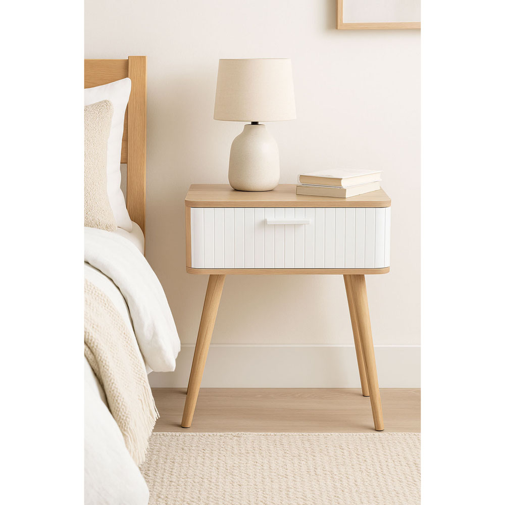 Κομοδίνο με συρτάρι σε μοντέρνο σχεδιασμό, με επιφάνεια σε φυσική όψη ξύλου, λευκό μπροστινό μέρος με κάθετες γραμμώσεις και εργονομική λαβή. Ιδανικό για υπνοδωμάτιο, σαλόνι ή γραφείο, συνδυάζει πρακτικότητα και κομψότητα.
