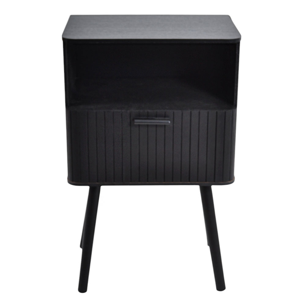 Κομοδίνο με ράφι και συρτάρι με μοντέρνο σχεδιασμό, σε μαύρη απόχρωση. Διαθέτει επιφάνεια και πλαϊνά με φυσική υφή ξύλου, μπροστινό μέρος με κάθετες γραμμώσεις και εργονομική λαβή. Στηρίζεται σε ξύλινα πόδια που προσφέρουν σταθερότητα και κομψότητα.