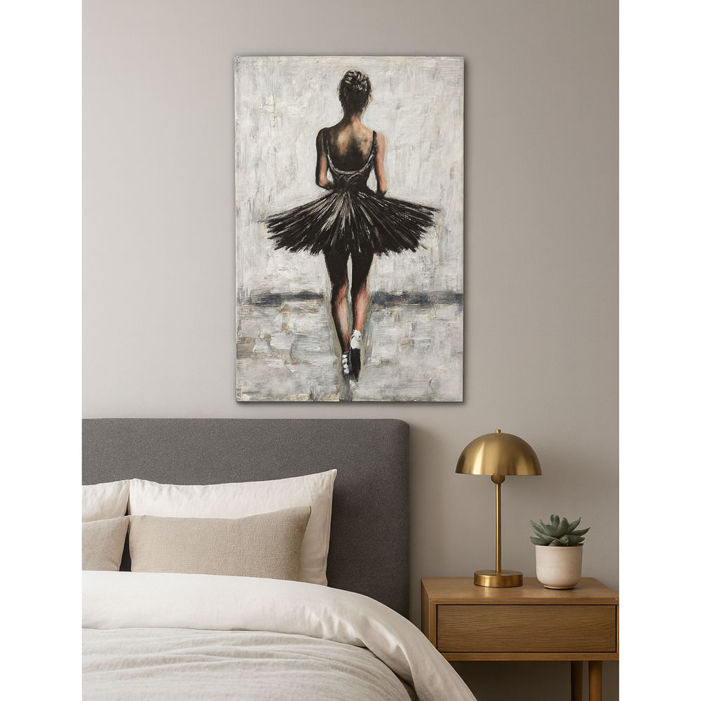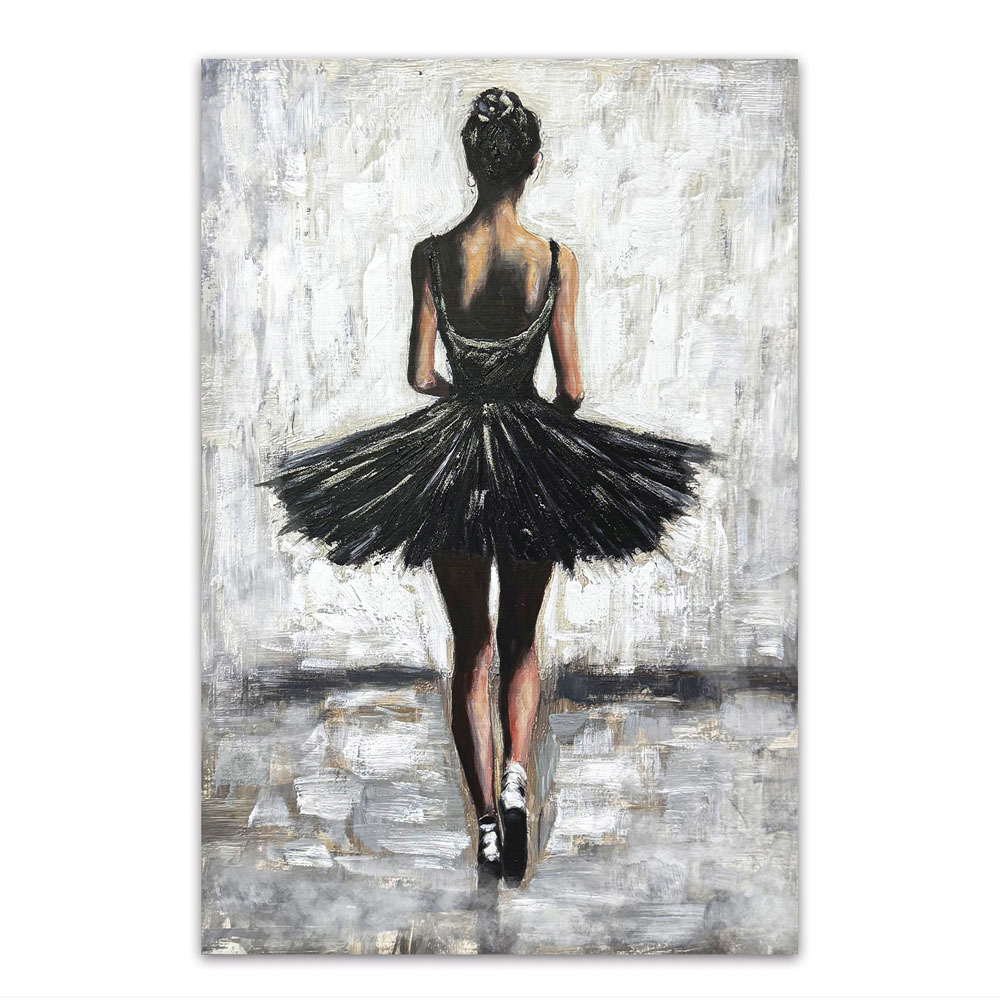 Πίνακας ελαιογραφία σε τυπωμένο καμβά με απεικόνιση μπαλαρίνας σε μαύρο φόρεμα. Η ανάγλυφη υφή και οι έντονες πινελιές δημιουργούν δυναμισμό και κομψότητα, αποτυπώνοντας την χάρη και την κίνηση του χορού. Ιδανική επιλογή για κάθε χώρο.