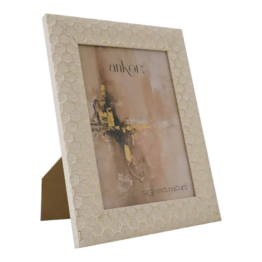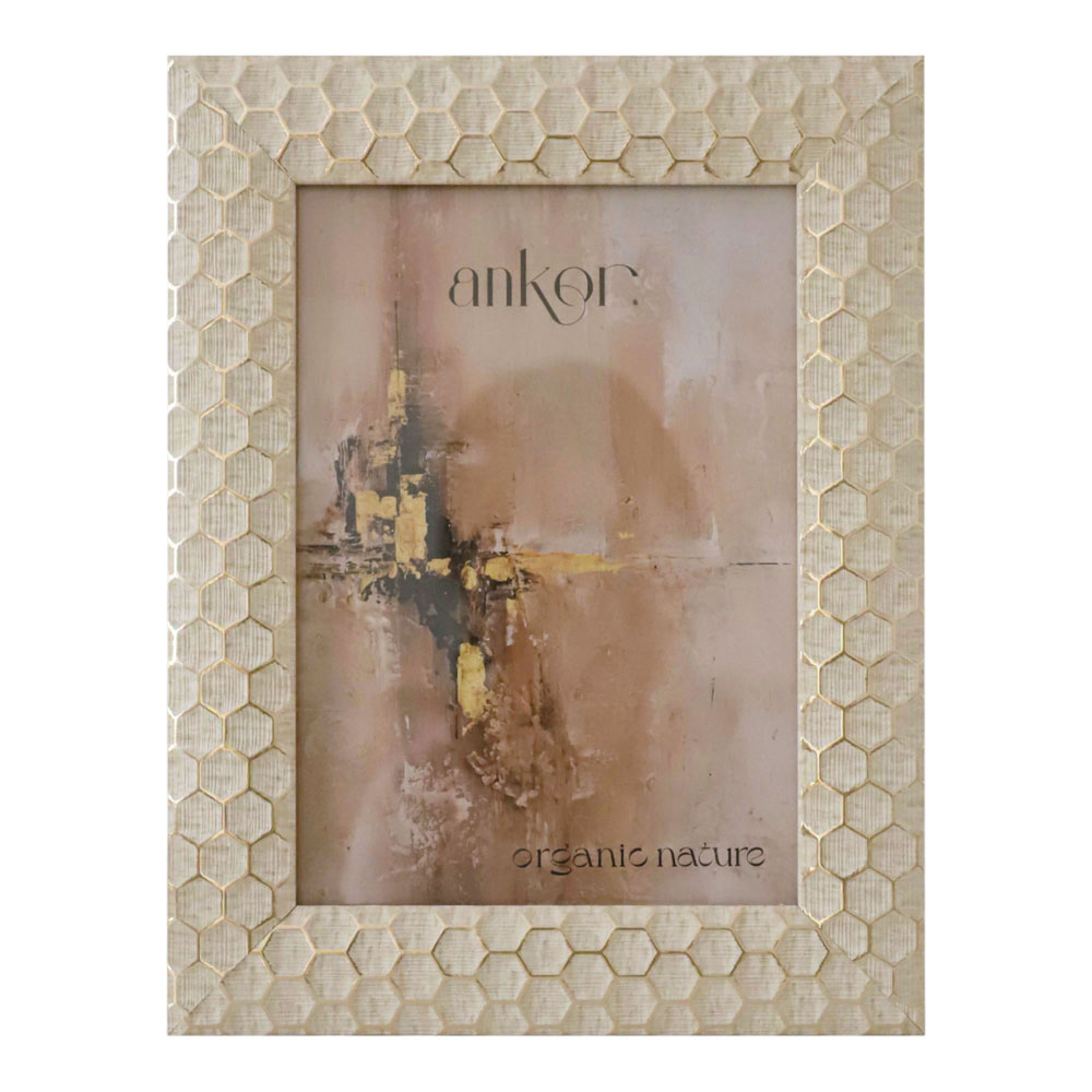Κορνίζα πλαστική σε μπεζ χρώμα με χρυσό εξάγωνο μοτίβο στο πλαίσιο που προσθέτει κομψότητα και λάμψη. Περιστρέφεται δίνοντας τη δυνατότητα τοποθέτησης οριζόντιας ή κάθετης φωτογραφίας και κρεμιέται στον τοίχο.