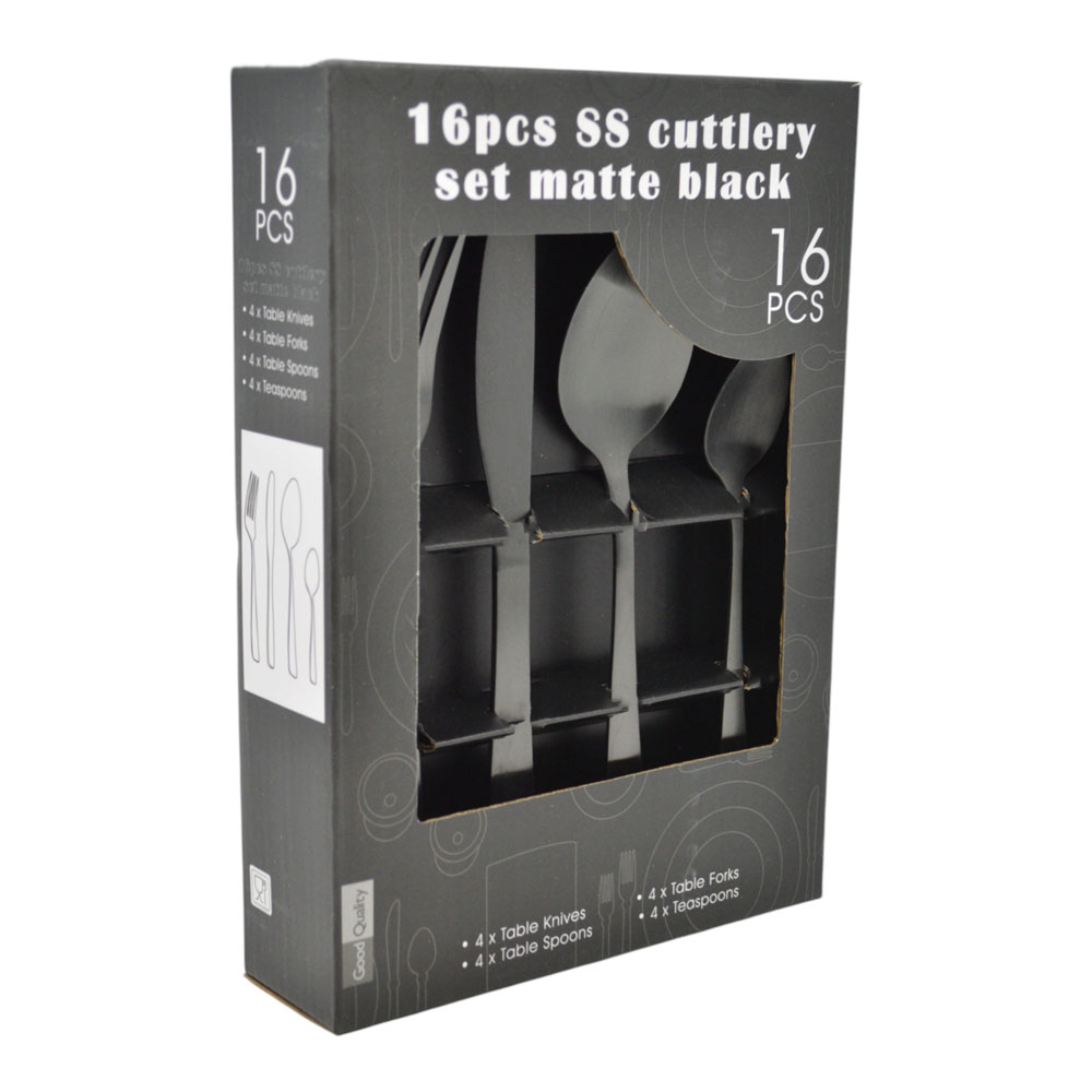 Σετ μαχαιροπίρουνα 16 τεμαχίων από ανοξείδωτο ατσάλι σε μαύρο ματ χρώμα. Ο μοντέρνος σχεδιασμός και το ματ φινίρισμα προσθέτουν κομψότητα σε κάθε τραπέζι. Ανθεκτικά στη χρήση και εύκολα στον καθαρισμό, ιδανικά για καθημερινή ή επίσημη χρήση.