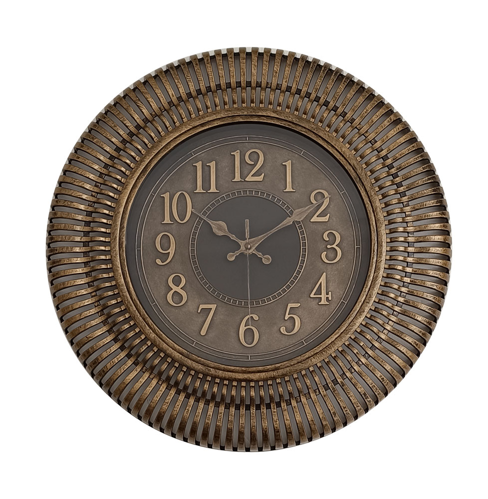 Ρολόι τοίχου με πλαστικό πλαίσιο σε αντικέ μπρονζέ απόχρωση και ανάγλυφο σχέδιο που του προσδίδει εντυπωσιακή εμφάνιση. Διαθέτει σκούρο καντράν με χρυσούς αριθμούς και δείκτες, συνδυάζοντας κομψότητα και ρετρό ύφος και αθόρυβο μηχανισμό.