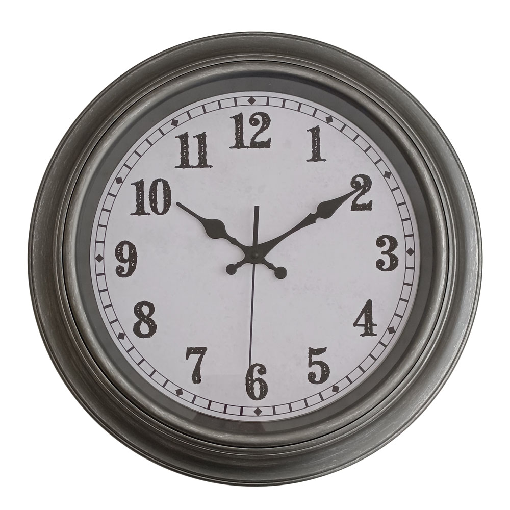 Ρολόι τοίχου με πλαστικό πλαίσιο σε ασημί αντικέ απόχρωση και λευκό καντράν με μαύρους αριθμούς σε ρετρό γραμματοσειρά. Οι δείκτες και ο αθόρυβος μηχανισμός του συνδυάζουν στυλ και λειτουργικότητα. Ιδανικό για σαλόνι ή γραφείο.