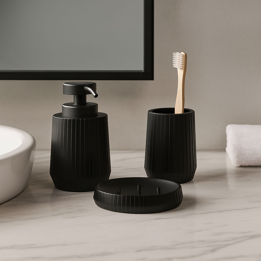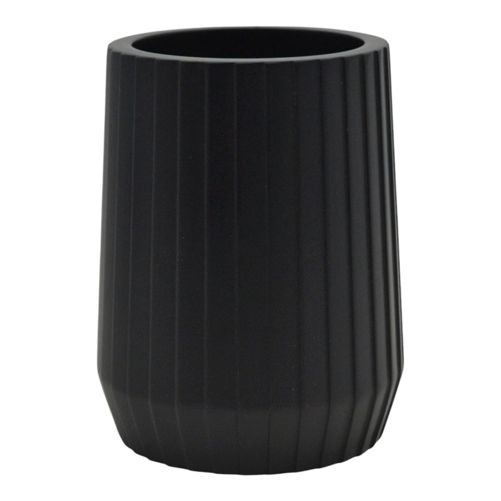 Ποτηροθήκη για οδοντόβουρτσες πολυεστερική σε μαύρο ματ χρώμα με κάθετη ριγωτή διακόσμηση. Ο μοντέρνος σχεδιασμός της προσφέρει μίνιμαλ αισθητική και ταιριάζει ιδανικά σε κάθε μπάνιο.