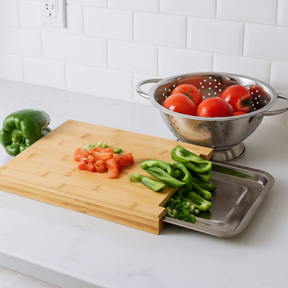 Ξύλο κοπής μπαμπού με αποσπώμενο δισκάκι από ανοξείδωτο ατσάλι. Ιδανικό για προετοιμασία φαγητού, καθώς επιτρέπει τη συλλογή των τεμαχισμένων υλικών ή υπολειμμάτων με ευκο.λία. Ανθεκτικό και πρακτικό, συνδυάζει λειτουργικότητα και μοντέρνο σχεδιασμό.
