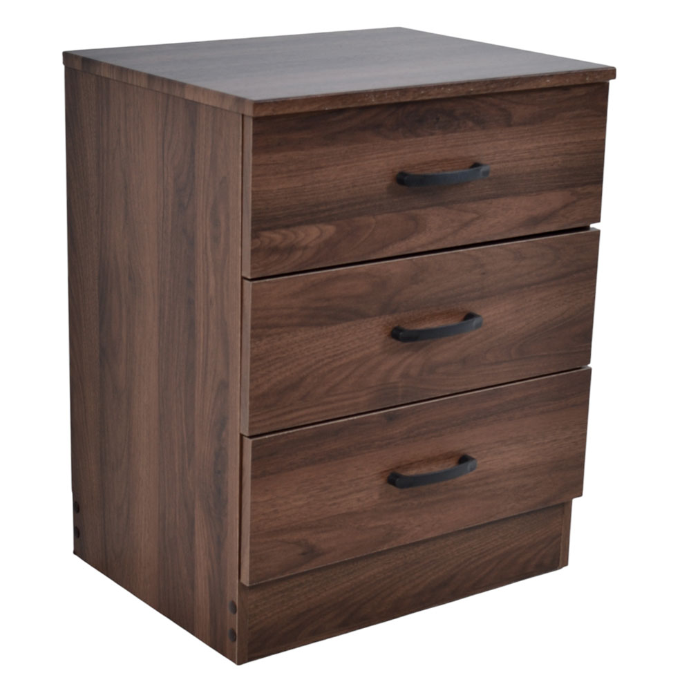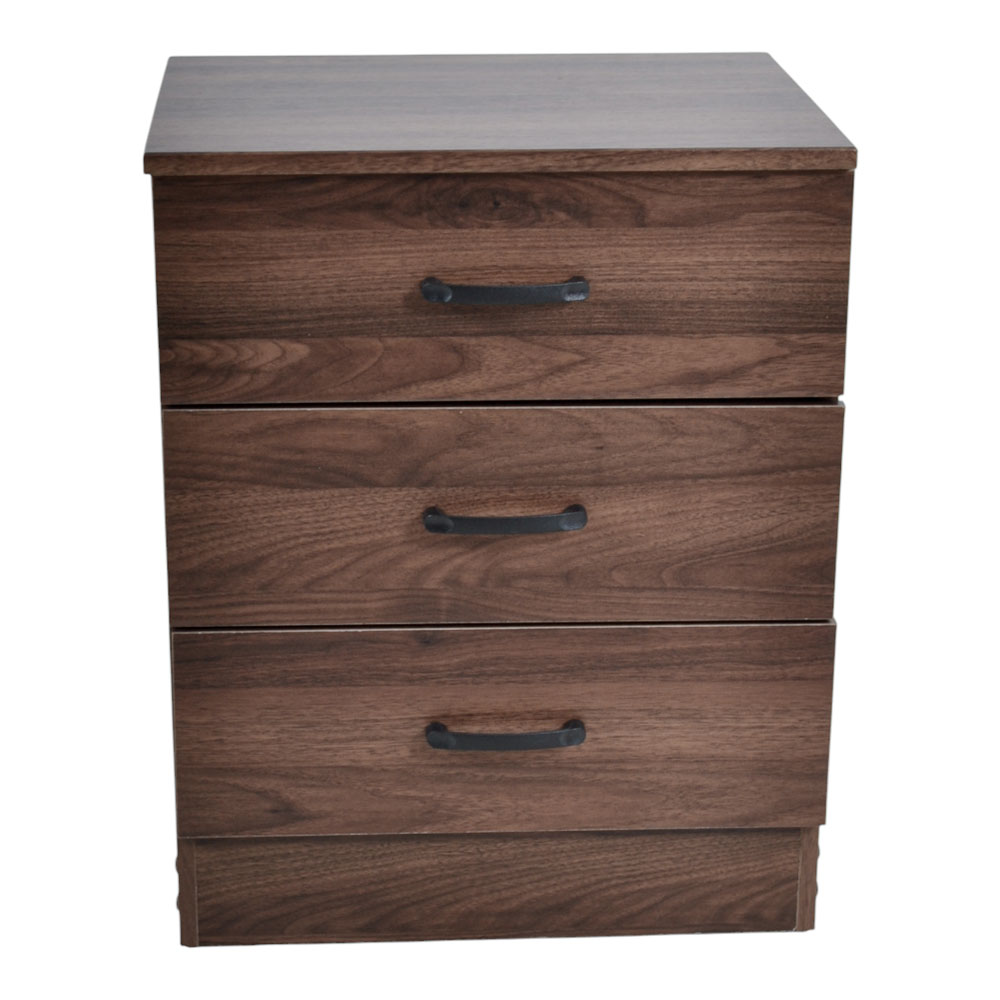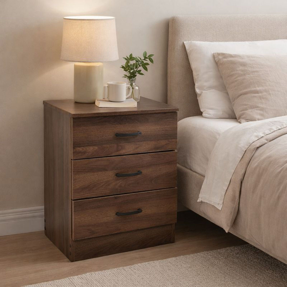 Κομοδίνο ξύλινο σε καρυδί χρώμα με τρία συρτάρια, ιδανικό για πρακτική αποθήκευση δίπλα στο κρεβάτι. Τα μαύρα χερούλια προσθέτουν μοντέρνες πινελιές σε έναν απλό και λειτουργικό σχεδιασμό που ταιριάζει σε κάθε υπνοδωμάτιο. Στην συσκευασία περιλαμβάνονται οδηγίες συναρμολόγησης.