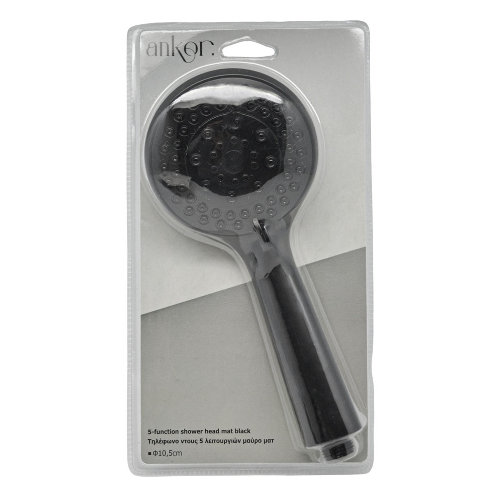 Τηλέφωνο ντους 5 λειτουργιών με κεφαλή διαμέτρου 10,5 εκ., κατασκευασμένο από ανθεκτικό ABS. Διαθέτει πέντε διαφορετικές επιλογές ροής, από ήπια έως πιο δυνατή πίεση, ενώ ο εργονομικός σχεδιασμός εξασφαλίζει εύκολο κράτημα. Ανθεκτικό στην υγρασία και στη φθορά, ιδανικό για καθημερινή χρήση με μοντέρνα εμφάνιση.