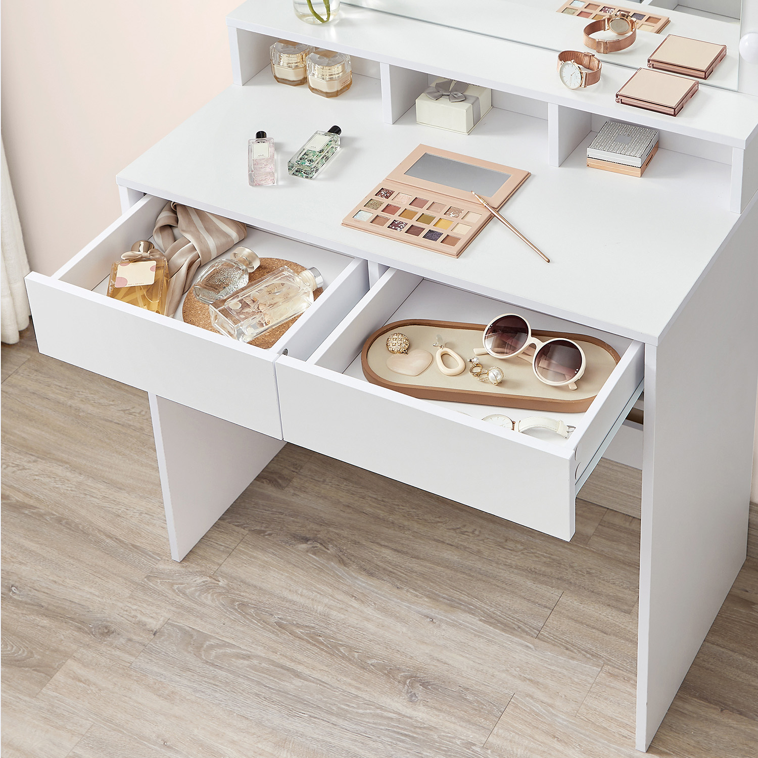Περισσότερη τάξη στα καλλυντικά σου: Τα 2 ευρύχωρα συρτάρια και τα 3 ανοιχτά διαμερίσματα προσφέρουν άφθονο χώρο για make-up και αξεσουάρ, κάνοντας την οργάνωση παιχνιδάκι.