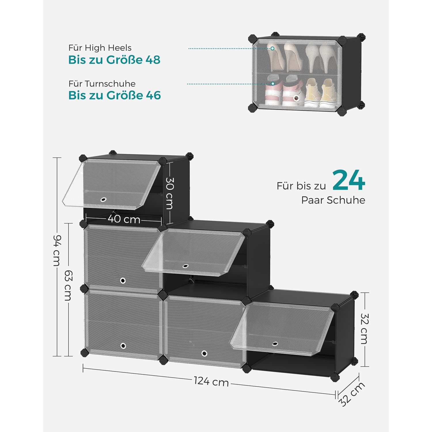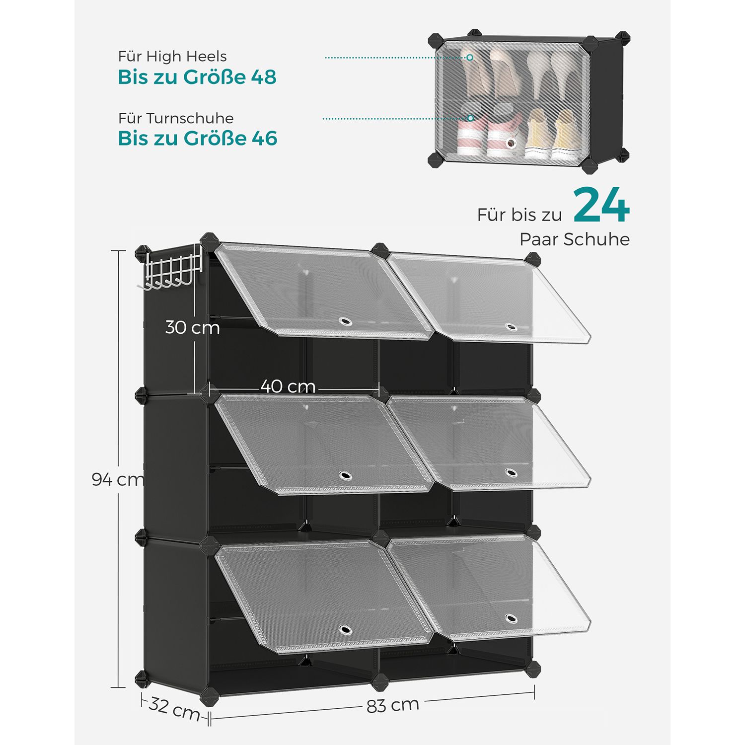 Η modular ραφιέρα παπουτσιών προσφέρει χώρο για έως 24 ζευγάρια παπούτσια, ενώ μπορεί να χρησιμοποιηθεί και για τσάντες ή ρούχα. Με τους πλευρικούς γάντζους, μπορείτε να κρεμάσετε καπέλα, αξεσουάρ ή λουριά κατοικιδίων.