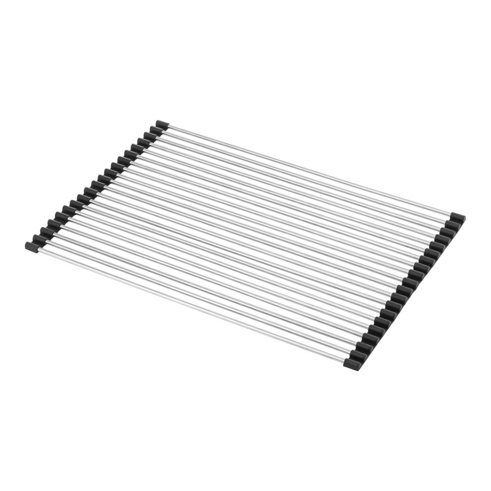 Πτυσσόμενη σχάρα στεγνώματος πάνω από τον νεροχύτη, με σωλήνες από ανοξείδωτο ατσάλι και άκρα από μαύρη σιλικόνη. Τοποθετείται εύκολα πάνω στον νεροχύτη και χρησιμοποιείται για στέγνωμα πιάτων, ποτηριών, φρούτων και λαχανικών, αλλά και ως βάση για ζεστές κατσαρόλες και τηγάνια. Ο αναδιπλούμενος σχεδιασμός της επιτρέπει εύκολη αποθήκευση χωρίς να πιάνει χώρο. Ανθεκτική και πολυχρηστική, ιδανική για καθημερινή χρήση στην κουζίνα.