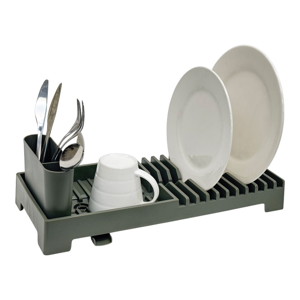 Πιατοθήκη πλαστική με θέσεις για πιάτα, δίσκο και αποσπώμενη θήκη για μαχαιροπίρουνα σε λαδί ματ χρώμα. Το ενσωματωμένο στόμιο αποστράγγισης βοηθά το νερό να φεύγει γρήγορα, κρατώντας τον πάγκο πιο καθαρό και στεγνό. Πρακτική και μοντέρνα, ιδανική για καθημερινή χρήση.