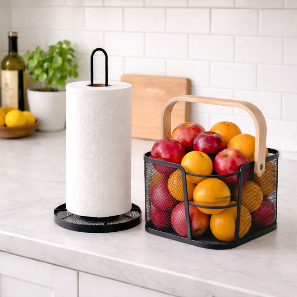 Μεταλλικό καλάθι κουζίνας με ανθεκτική διάτρητη κατασκευή και ξύλινη λαβή για εύκολη μεταφορά. Ιδανικό για αποθήκευση τροφίμων, φρούτων ή αξεσουάρ κουζίνας, συνδυάζει πρακτικότητα με μοντέρνο σχεδιασμό που ταιριάζει σε κάθε πάγκο.