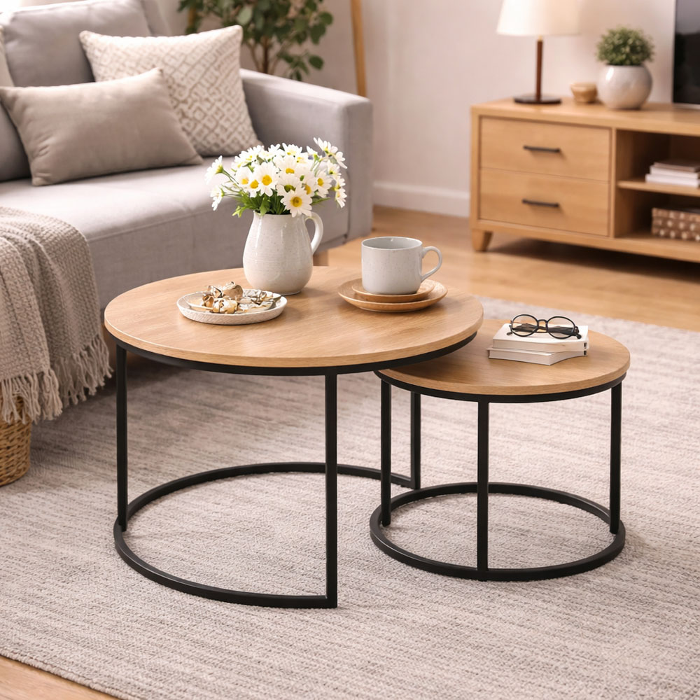 Σετ 2 Τραπεζάκια MDF Με Μελαμίνη Φυσική & Μαύρο Μεταλλικό Σκελετό ANKOR