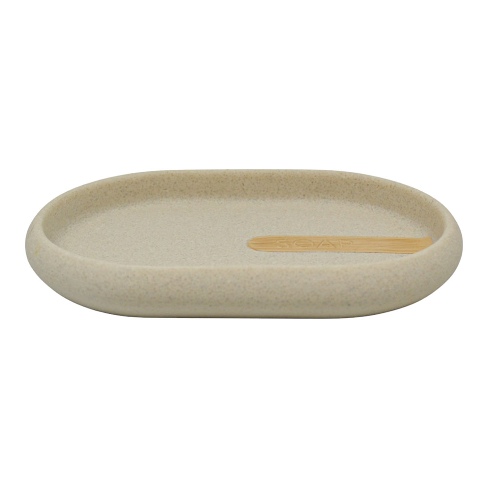 Σαπουνοθήκη μπάνιου με μοντέρνο και λιτό σχεδιασμό, κατασκευασμένη από ανθεκτικό πολυεστερικό υλικό με ελαφρώς ανάγλυφη, σαγρέ επιφάνεια. Διαθέτει πρακτικό σχήμα που συγκρατεί το σαπούνι στη θέση του, ενώ η διακριτική ξύλινη λεπτομέρεια προσθέτει φυσική αισθητική στον χώρο. Ιδανική για καθημερινή χρήση, συνδυάζει λειτουργικότητα και κομψότητα σε κάθε μπάνιο.