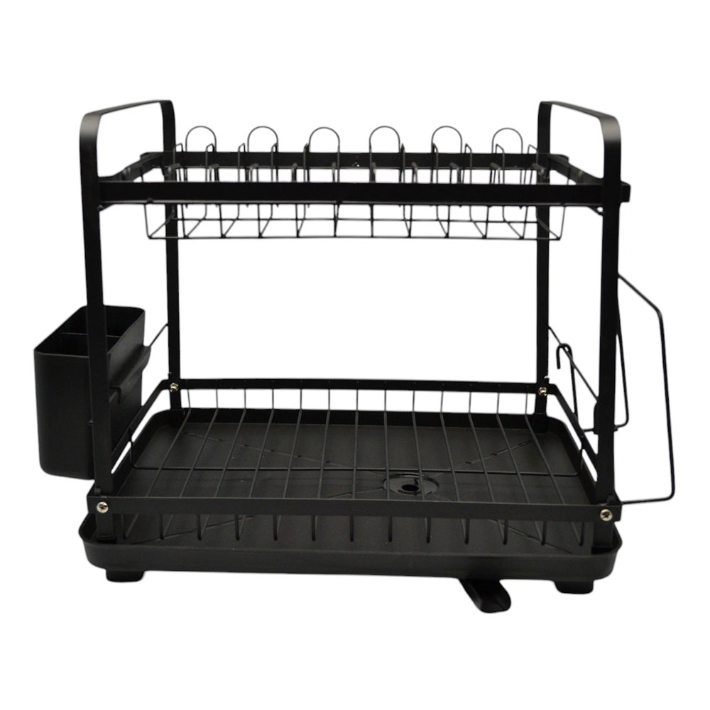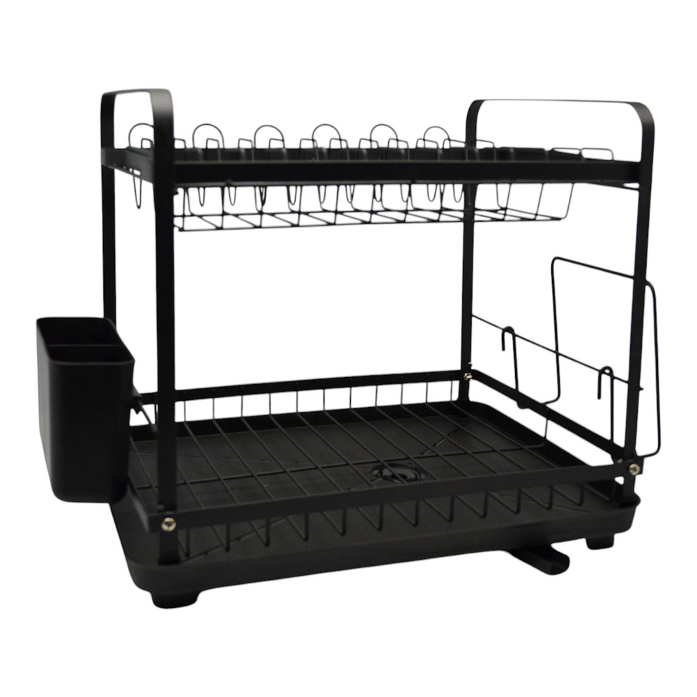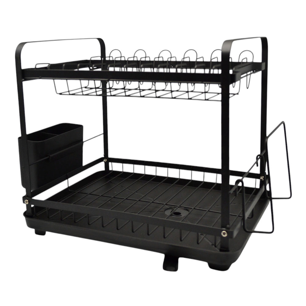 Πιατοθήκη διώροφη μεταλλική με μαύρο ματ φινίρισμα, ιδανική για οργανωμένη και πρακτική αποθήκευση πιάτων και σκευών. Διαθέτει πλαστικό δίσκο συλλογής νερού και κουταλοθήκη για εύκολη τακτοποίηση μαχαιροπίρουνων. Το ενσωματωμένο στόμιο αποστράγγισης απομακρύνει αποτελεσματικά το νερό, διατηρώντας τον πάγκο σας στεγνό και καθαρό. Περιλαμβάνει επίσης ειδική θήκη για τοποθέτηση επιφάνειας κοπής, προσφέροντας ακόμη μεγαλύτερη ευκολία στην καθημερινή χρήση. Πλένεται εύκολα και αποτελεί μια λειτουργική και κομψή επιλογή για κάθε κουζίνα.